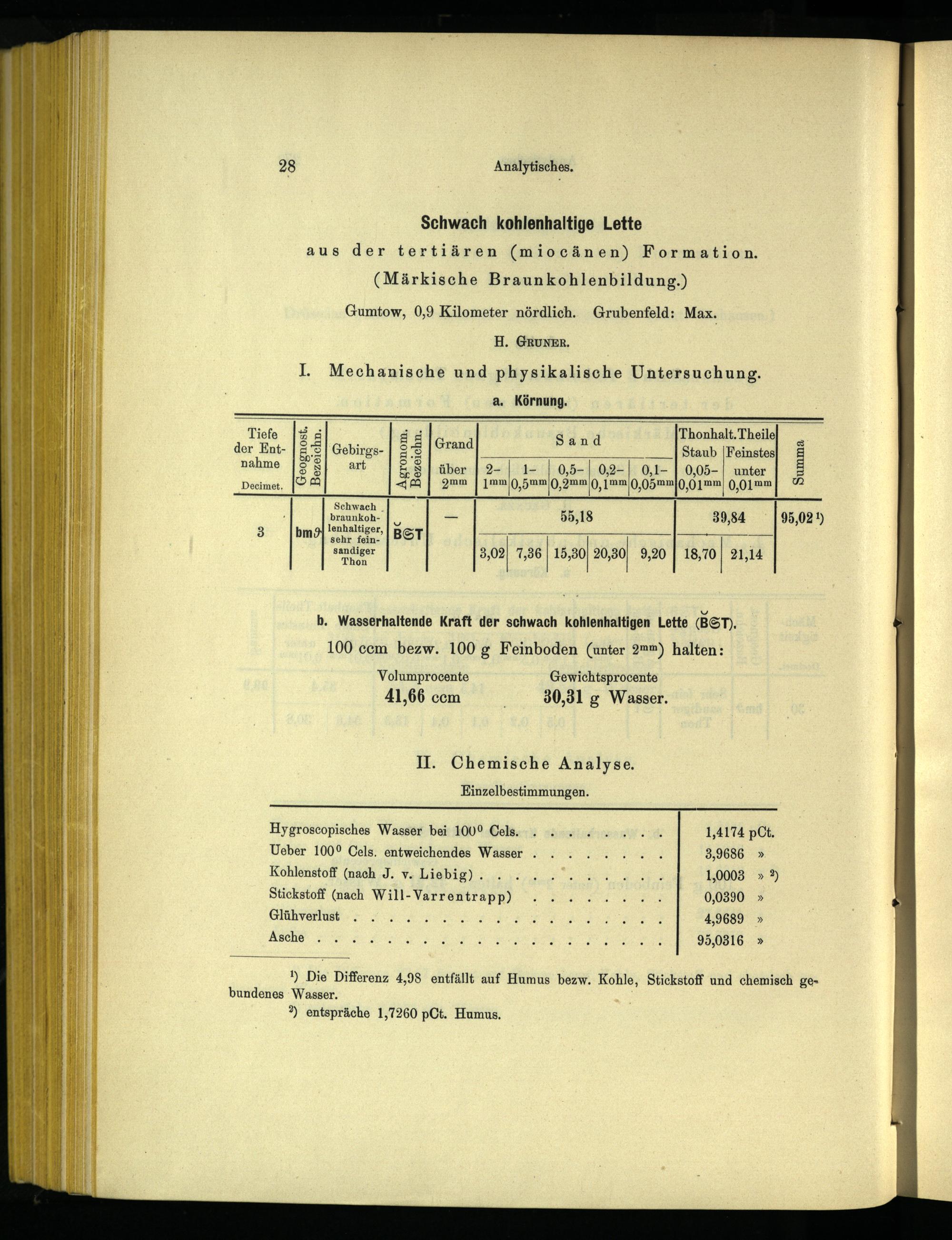 ') Die Differenz 4,98 entfällt auf Humus bezw. Kohle, Stickstoff und chemisch ge