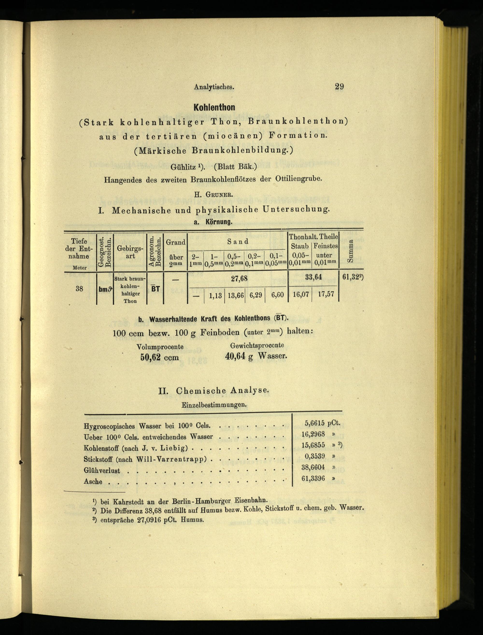 1) bei Kahrstedt an der Berlin- Hamburger Eisenbahn. 2) Die Differenz 38,68 entfällt auf Humus bezw. Kohle, Stickstoff u. chem. geb. Wasser. 3) entspräche 27,0916 pCt. Humus.
