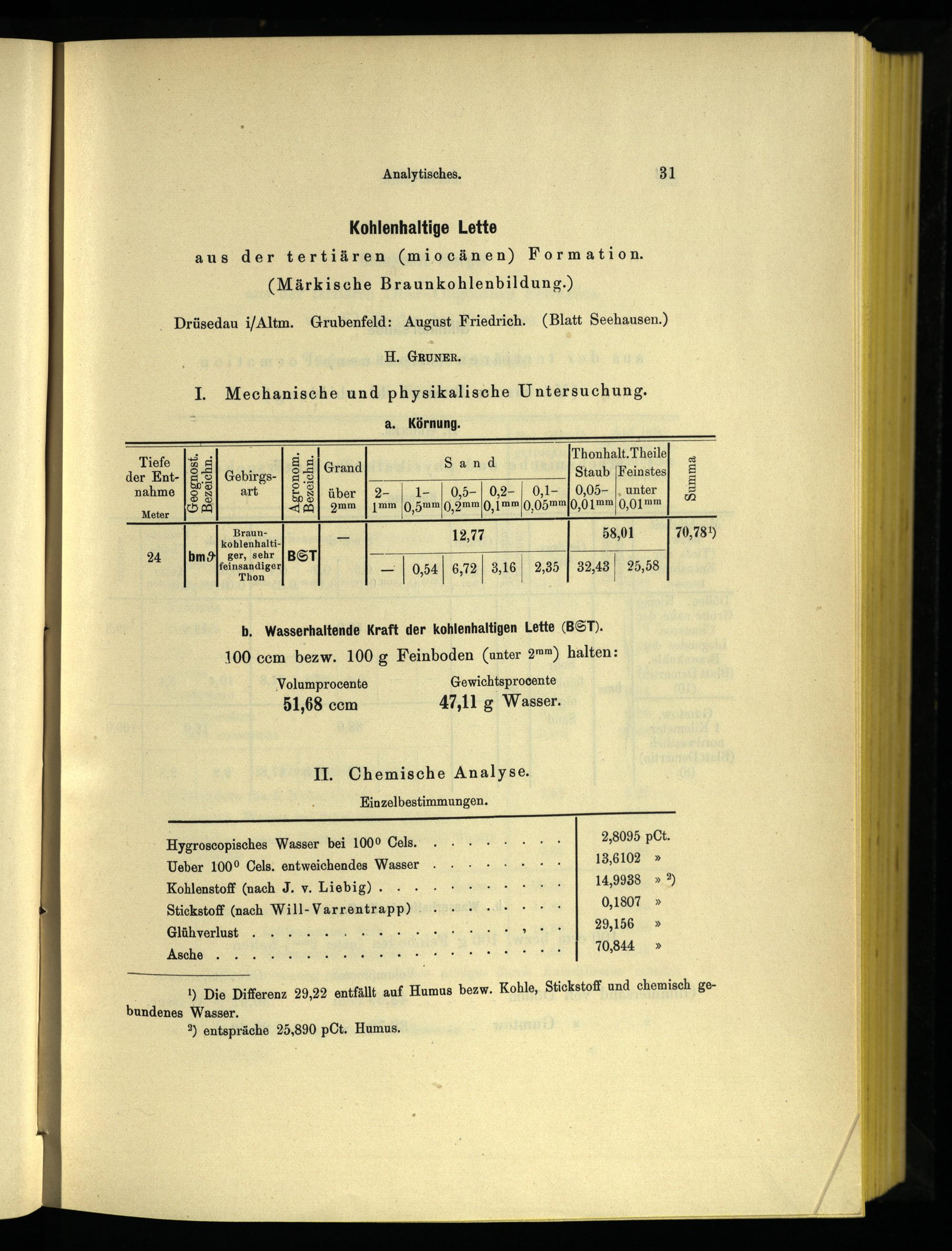 1) Die Differenz 29,22 entfällt auf Humus bezw. Kohle, Stickstoff und chemisch ge