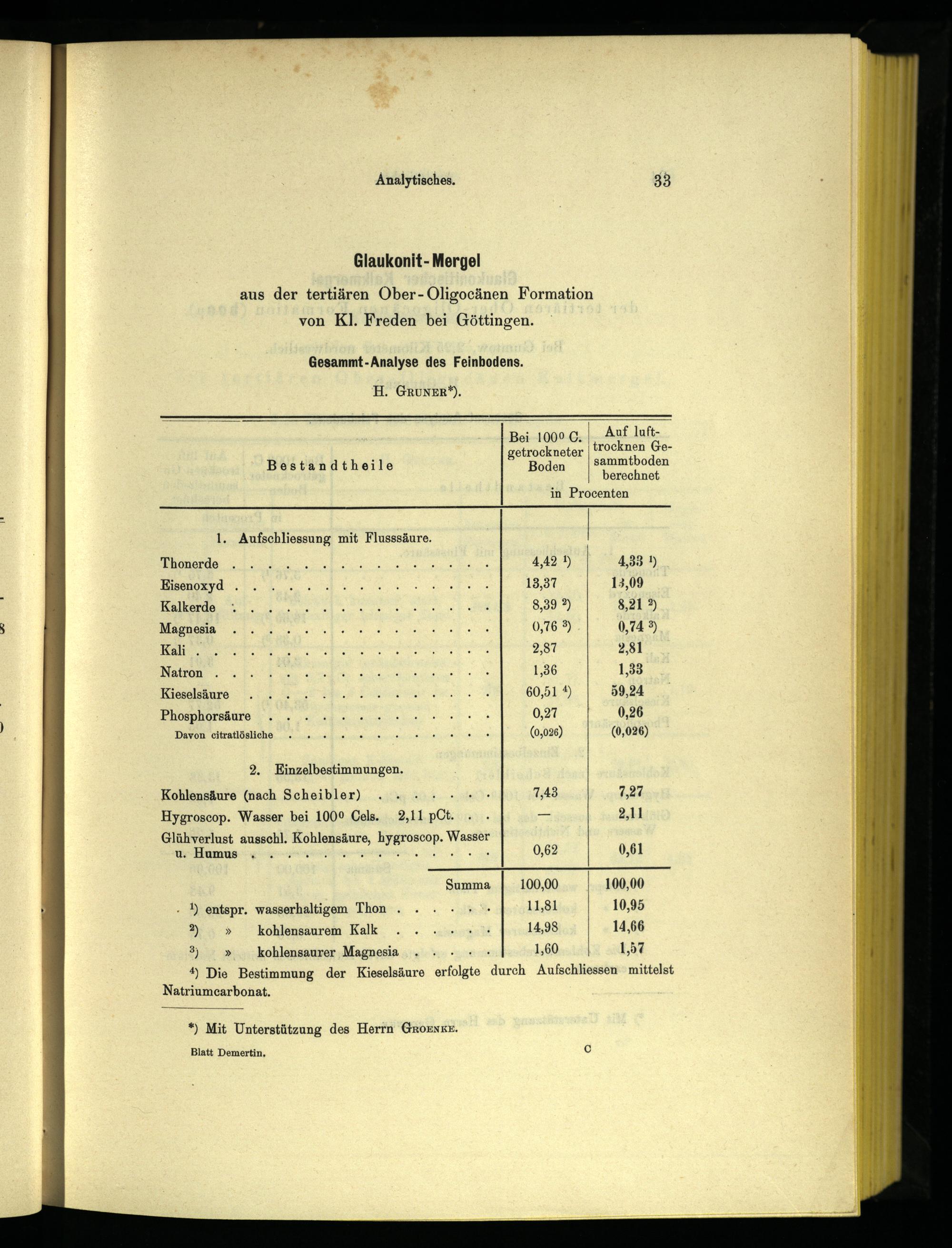 2. Einzelbestimmungen. Kohlensäure(nach Scheibler). Hygroscop. Wasser bei 100% Cels. 2,11 pCt. Glühverlust ausschl. Kohlensiure byEroacOn- Y Wasser u. Humus vn.. Summa - 1) entspr. wasserhaltigem Thon. 2)>» Kohlensaurem Kalk 3)=» kohlensaurer Magnesia