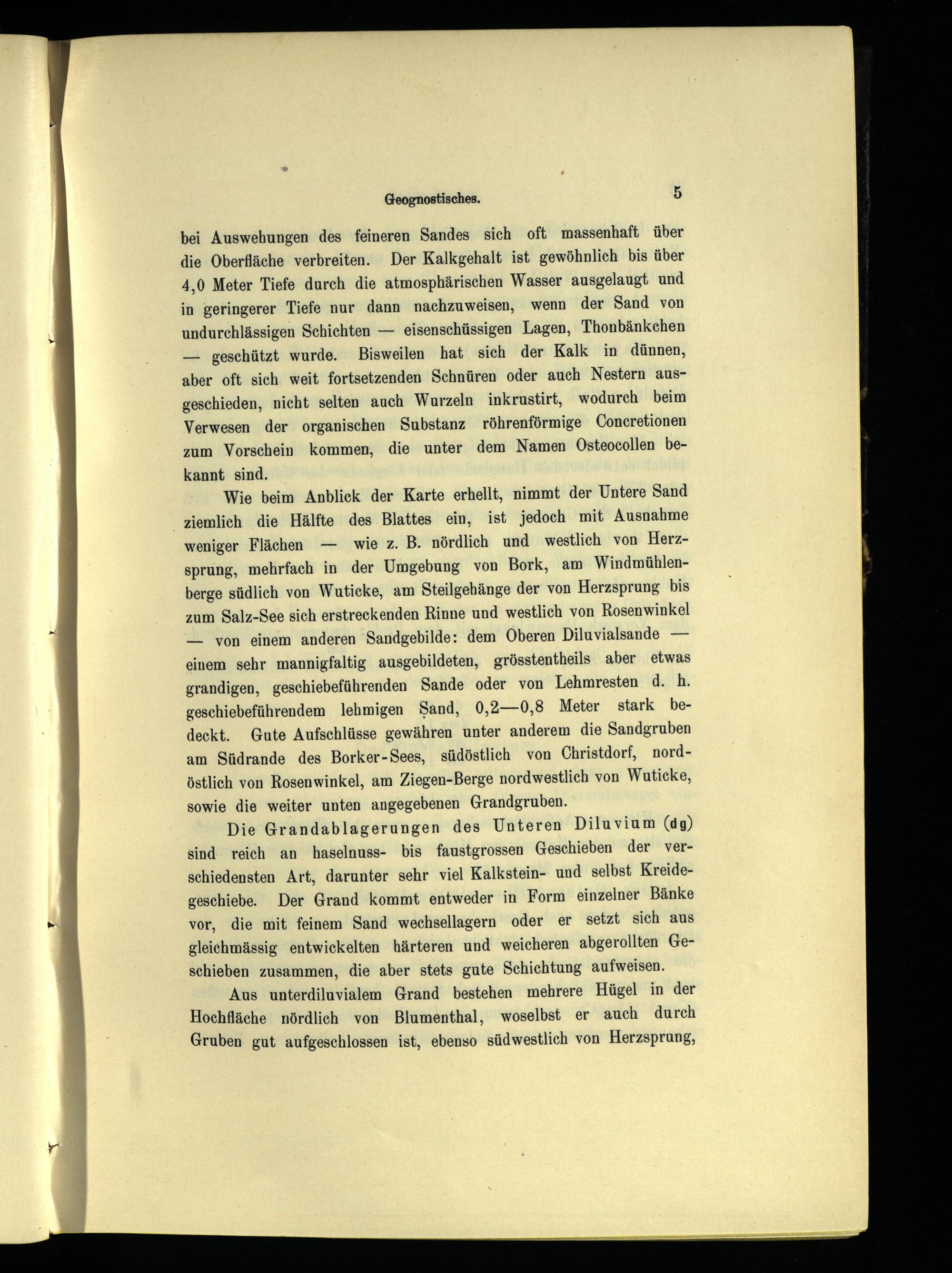 Wie beim Anblick der Karte erhellt, nimmt der Untere Sand ziemlich die Hälfte des Blattes ein, ist jedoch mit Ausnahme weniger Flächen— wie z. B. nördlich und ‚westlich von Herzsprung, mehrfach in der Umgebung von Bork, am Windmühlenberge südlich von Wuticke, am Steilgehänge der von Herzsprung bis zum Salz-See sich erstreckenden Rinne und westlich von Rosenwinkel — von einem anderen Sandgebilde: dem Oberen Diluvialsande— einem sehr mannigfaltig ausgebildeten, grösstentheils aber etwas grandigen, geschiebeführenden Sande oder von Lehmresten d. h. geschiebeführendem lehmigen Sand, 0,2—0,8 Meter stark bedeckt. Gute Aufschlüsse gewähren unter anderem die Sandgruben am Südrande des Borker-Sees, südöstlich von Christdorf, nordöstlich von Rosenwinkel, am Ziegen-Berge nordwestlich von Wuticke, sowie die weiter unten angegebenen Grandgruben.