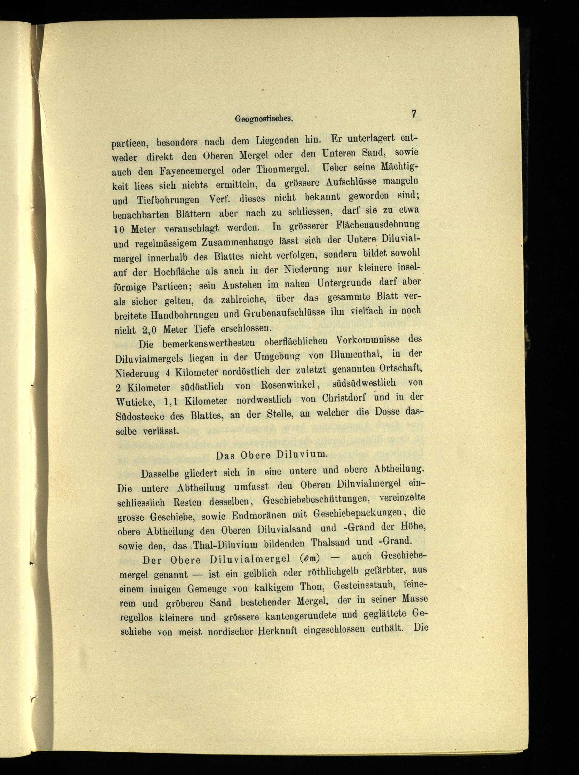 Die bemerkenswerthesten oberflächlichen Vorkommnisse des Diluvialmergels liegen in der Umgebung von Blumenthal, in der Niederung 4 Kilometer‘ nordöstlich der zuletzt genannten Ortschaft, 2 Kilometer südöstlich von Rosenwinkel, südsüdwestlich von Wuticke, 1,1 Kilometer nordwestlich von Christdorf und in der Südostecke des Blattes, an der Stelle, an welcher die Dosse dasselbe verlässt.