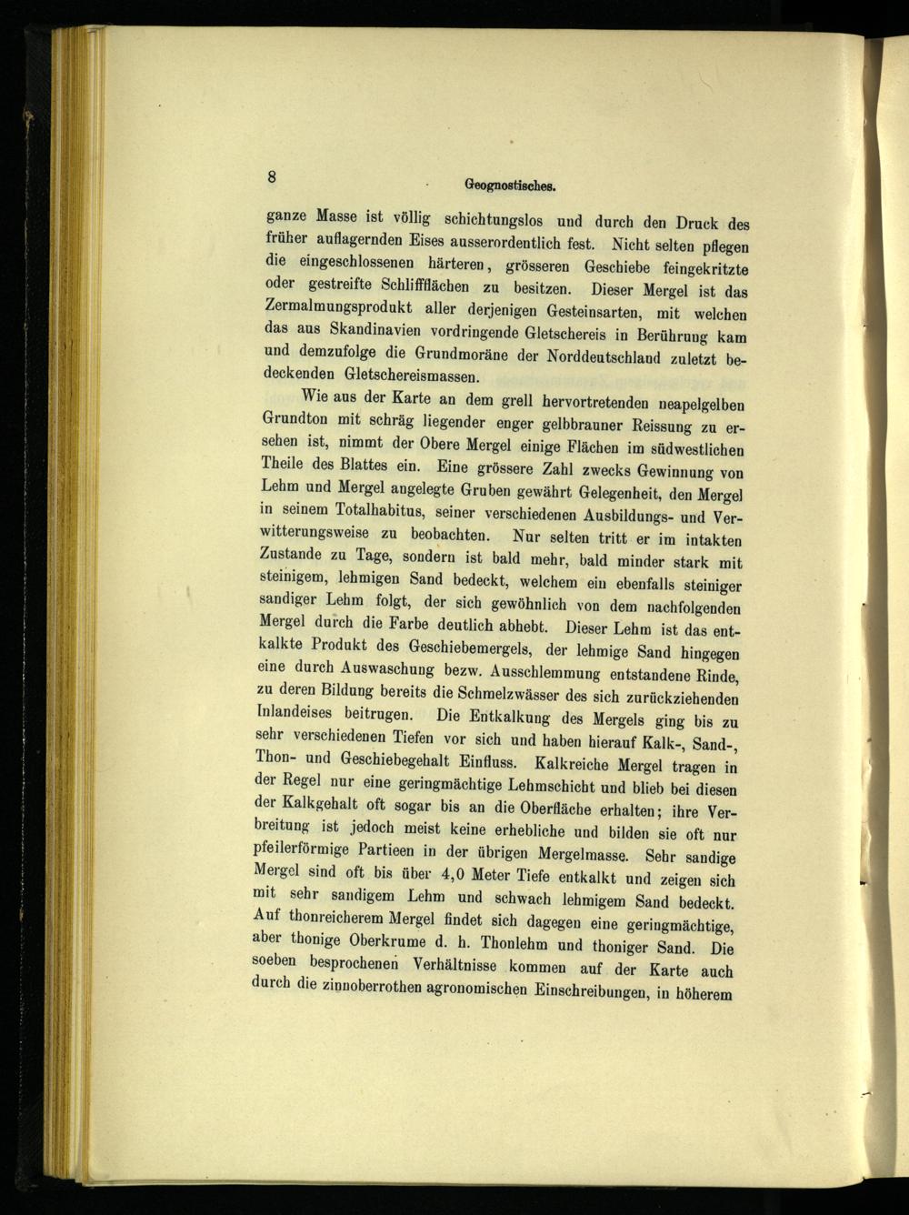 Wie aus der Karte an dem grell hervortretenden neapelgelben Grundton mit schräg liegender enger gelbbrauner Reissung zu ersehen ist, nimmt der Obere Mergel einige Flächen im südwestlichen Theile des Blattes ein. Eine grössere Zahl zwecks Gewinnung von Lehm und Mergel angelegte Gruben gewährt Gelegenheit, den Merge] in seinem Totalhabitus, seiner verschiedenen Ausbildungs- und Verwitterungsweise zu beobachten. Nur selten tritt er im intakten Zustande zu Tage, sondern ist bald mehr, bald minder stark mit steinigem, lehmigen Sand bedeckt, welchem ein ebenfalls steiniger sandiger Lehm folgt, der sich gewöhnlich von dem nachfolgenden Mergel durch die Farbe deutlich abhebt. Dieser Lehm ist das entkalkte Produkt des Geschiebemergels, der lehmige Sand hingegen eine durch Auswaschung bezw. Ausschlemmung entstandene Rinde, zu deren Bildung bereits die Schmelzwässer des sich zurückziehenden Inlandeises beitrugen. Die Entkalkung des Mergels ging bis zu sehr verschiedenen Tiefen vor sich und haben hierauf Kalk-, Sand-, Thon- und Geschiebegehalt Einfluss. Kalkreiche Mergel tragen in der Regel nur eine geringmächtige Lehmschicht und blieb bei diesen der Kalkgehalt oft sogar bis an die Oberfläche erhalten; ihre Verbreitung ist jedoch meist keine erhebliche und bilden sie oft‘ nur pfeilerförmige Partieen in der übrigen Mergelmasse. Sehr sandige Mergel sind oft bis über 4,0 Meter Tiefe entkalkt und zeigen sich mit sehr sandigem Lehm und schwach lehmigem Sand bedeckt. Auf thonreicherem Mergel findet sich dagegen eine geringmächtige, aber thonige Oberkrume d. h. Thonlehm und thoniger Sand. Die soeben besprochenen Verhältnisse kommen auf. der Karte auch durch die zinnoberrothen agronomischen Einschreibungen, in höherem