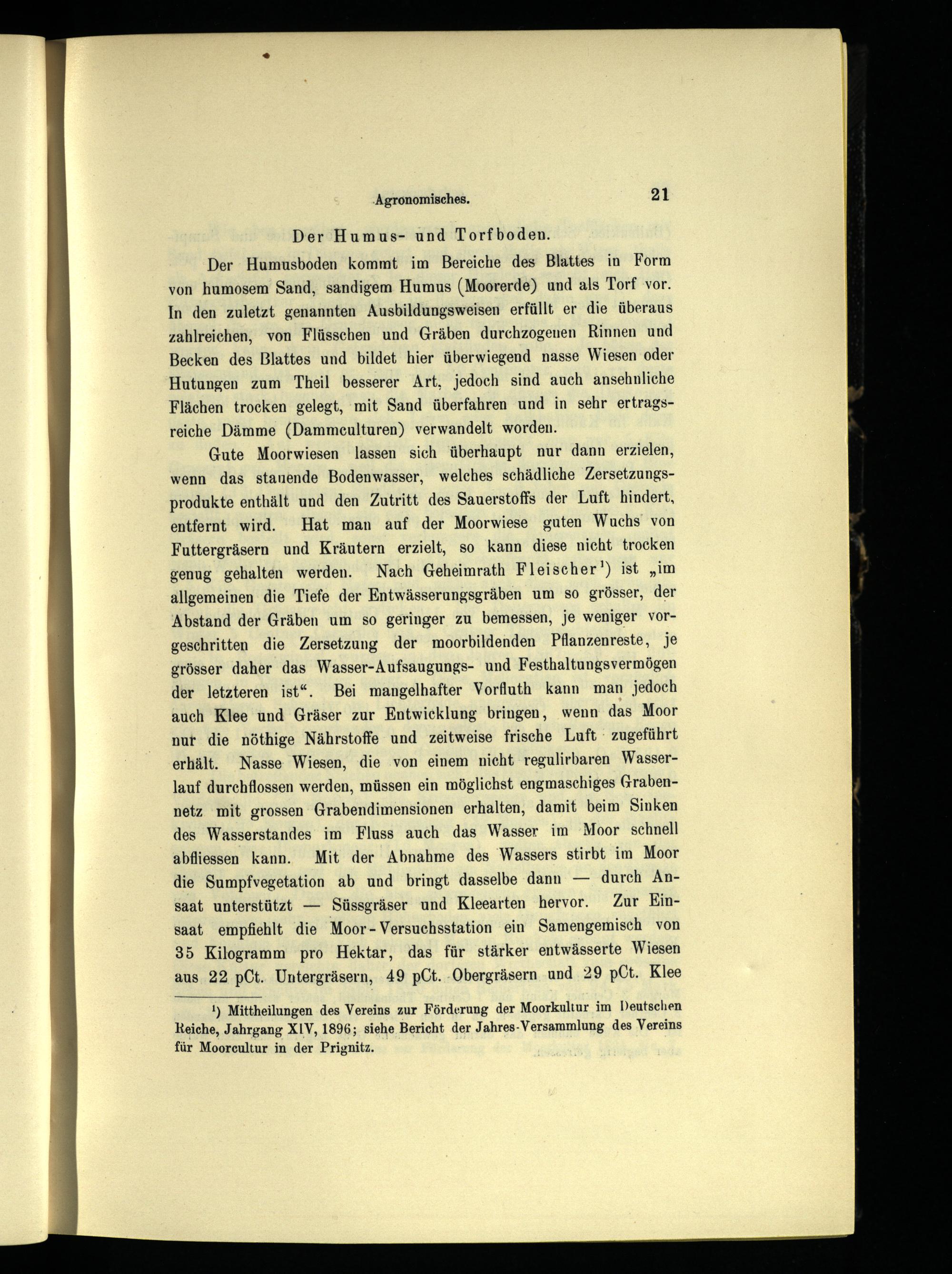Gute Moorwiesen lassen sich überhaupt nur dann erzielen, wenn das stanende Bodenwasser, welches schädliche Zersetzungsprodukte enthält und den Zutritt des Sauerstoffs der Luft hindert, entfernt wird. Hat man auf der Moorwiese guten Wuchs von Futtergräsern und Kräutern erzielt, so kann diese nicht trocken genug gehalten werden. Nach Geheimrath Fleischer!) ist„im allgemeinen die Tiefe der Entwässerungsgräben um so grösser, der Abstand der Gräben um so geringer zu bemessen, je weniger vorgeschritten die Zersetzung der moorbildenden Pflanzenreste, je grösser daher das Wasser-Aufsaugungs- und Festhaltungsvermögen der letzteren ist“. Bei mangelhafter Vorfluth kann man jedoch auch Klee und Gräser zur Entwicklung bringen, wenn das Moor nur die nöthige Nährstoffe und zeitweise frische Luft zugeführt erhält. Nasse Wiesen, die von einem nicht regulirbaren Wasserlauf durchflossen werden, müssen ein möglichst engmaschiges Graben