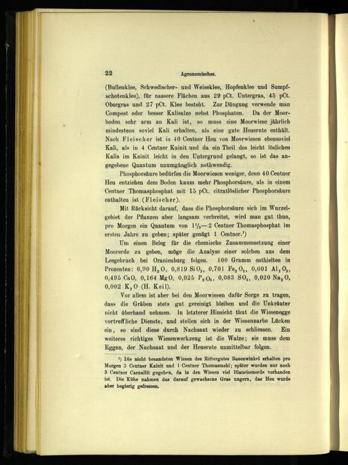 Phosphorsäure bedürfen die Moorwiesen weniger, denn 40 Centner Heu entziehen dem Boden kaum mehr Phosphorsäure, als in einem Centner Thomasphosphat mit 15 pCt. citratlöslicher Phosphorsäure enthalten ist(Fleischer).