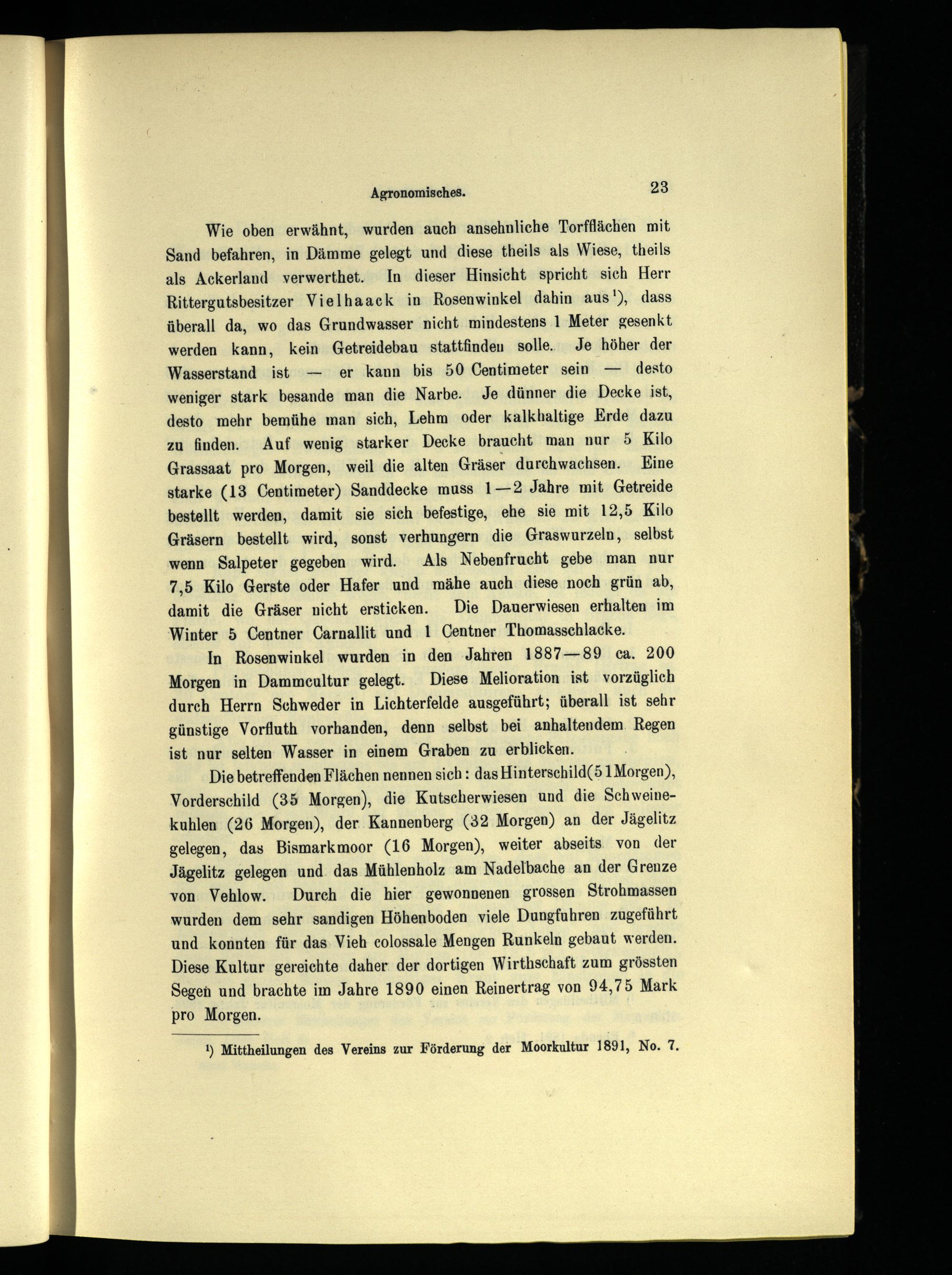 In Rosenwinkel wurden in den ‚Jahren 1887—89 ca. 200 Morgen in Dammcultur gelegt. Diese Melioration ist vorzüglich durch Herrn Schweder in Lichterfelde ausgeführt; überall ist sehr günstige Vorfluth vorhanden, denn selbst bei anhaltendem. Regen ist nur selten Wasser in einem Graben zu erblicken.