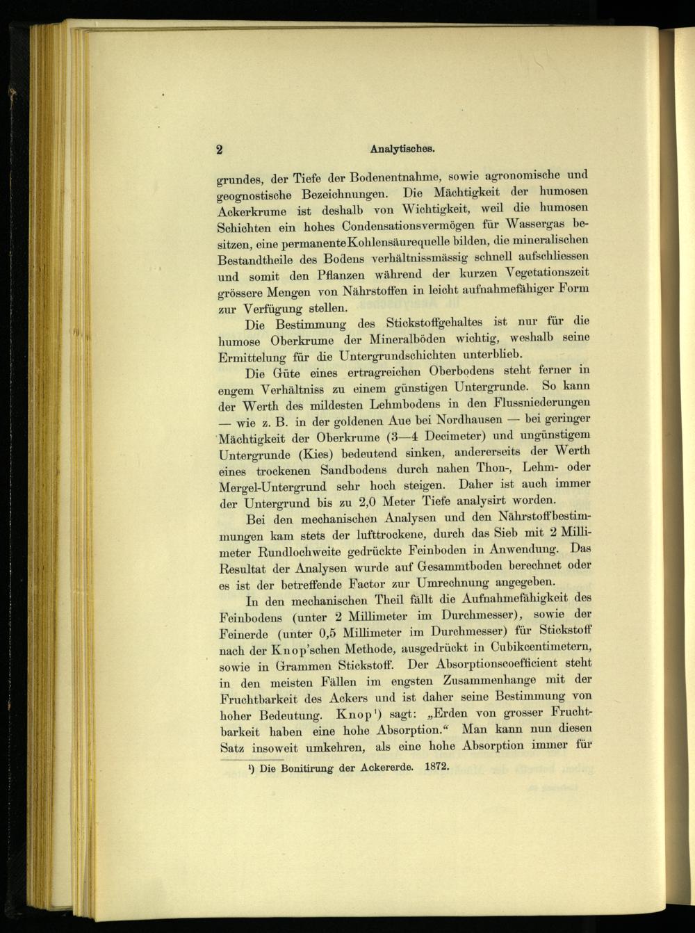 In den mechanischen Theil fällt die Aufnahmefähigkeit des Feinbodens(unter 2 Millimeter im Durchmesser), sowie der Feinerde(unter 0,5 Millimeter im Durchmesser) für Stickstoff nach der Knop’schen Methode, ausgedrückt in Cubikcentimetern, sowie in Grammen Stickstoff. Der Absorptionscoefficient steht in den meisten Fällen im engsten Zusammenhange mit der Fruchtbarkeit des Ackers und ist daher seine Bestimmung von hoher Bedeutung. Knop') sagt:„Erden von grosser Fruchtbarkeit haben eine hohe Absorption.“ Man kann nun diesen Satz insoweit umkehren, als eine hohe Absorption immer für