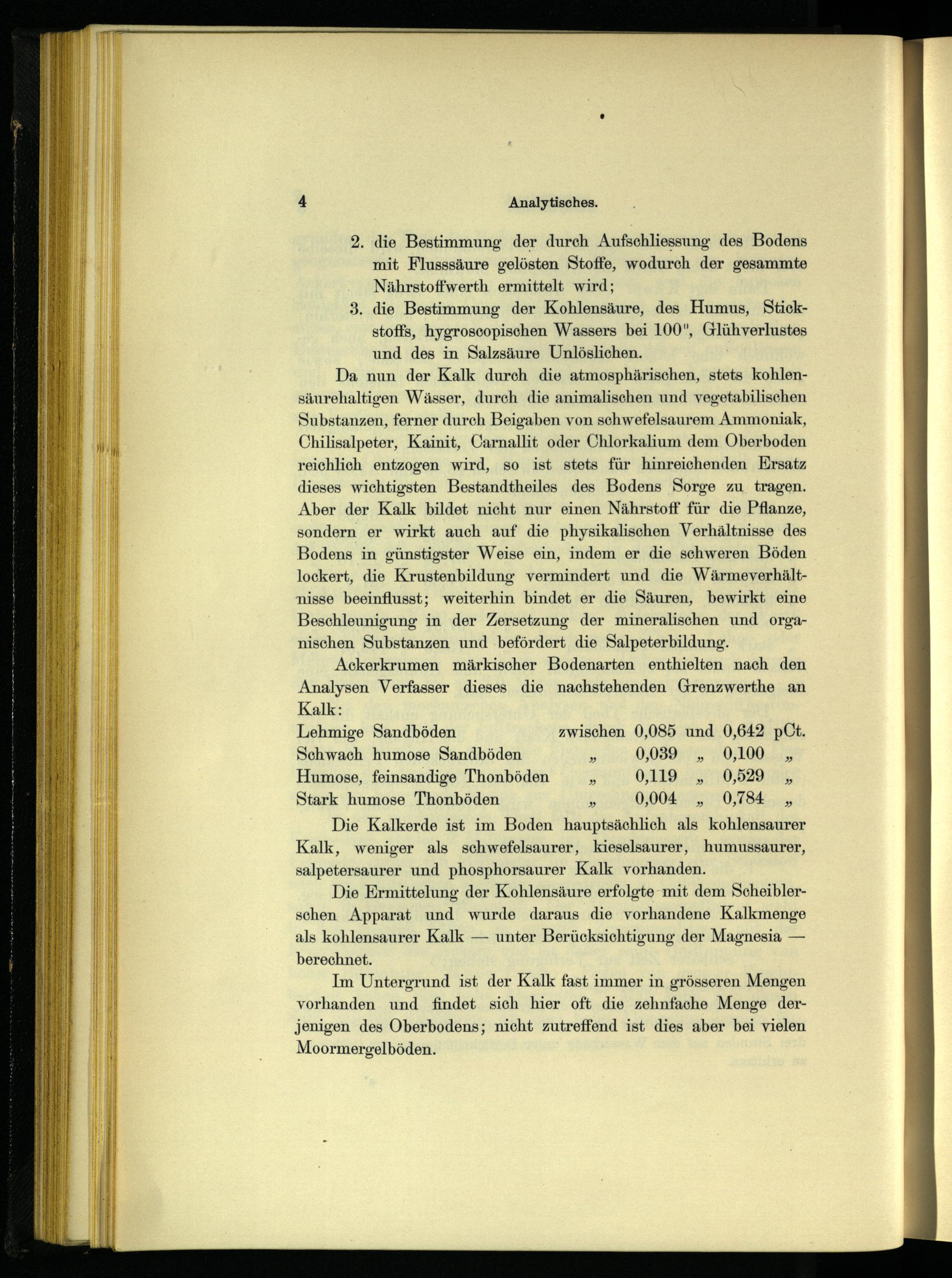 3. die Bestimmung der Kohlensäure, des Humus, Stickstoffs, hygroscopischen Wassers bei 100", Glühverlustes und des in Salzsäure Unlöslichen.