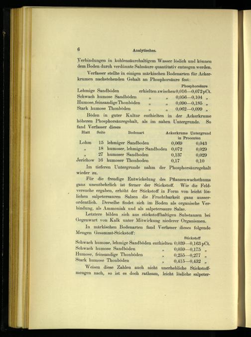 Verfasser stellte in einigen märkischen Bodenarten für Ackerkrumen nachstehenden Gehalt an Phosphorsäure fest: Phosphorsäure Lehmige Sandböden erhielten zwischen 0,016—0,072 pCt. Schwach humose Sandböden»„ 0,056—0,104„ Humose, feinsandige Thonböden„. 0,090—0,185 Stark humose Thonböden”„ 0,062—0,099,