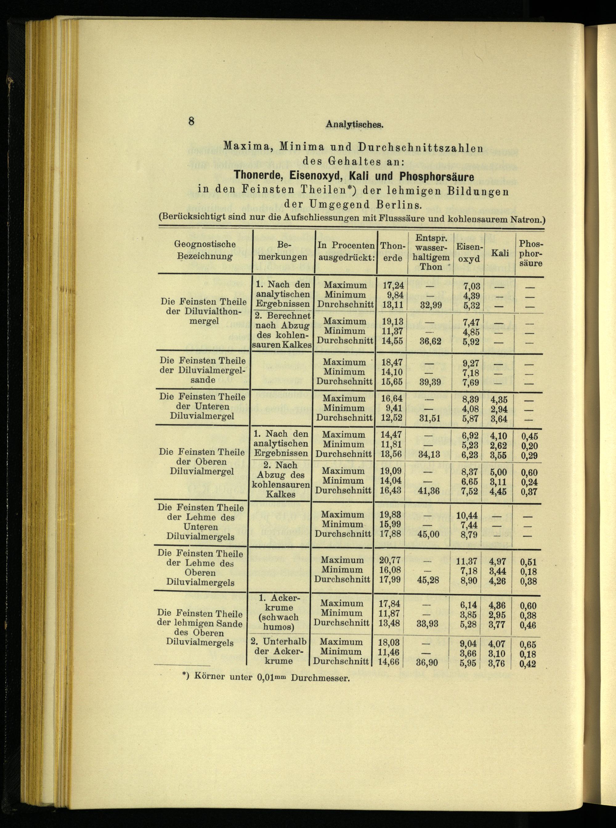 Maxima, Minima und Durchschnittszahlen des Gehaltes an: Thonerde, Eisenoxyd, Kali und Phosphorsäure in den Feinsten Theilen*) der lehmigen Bildungen der Umgegend Berlins.