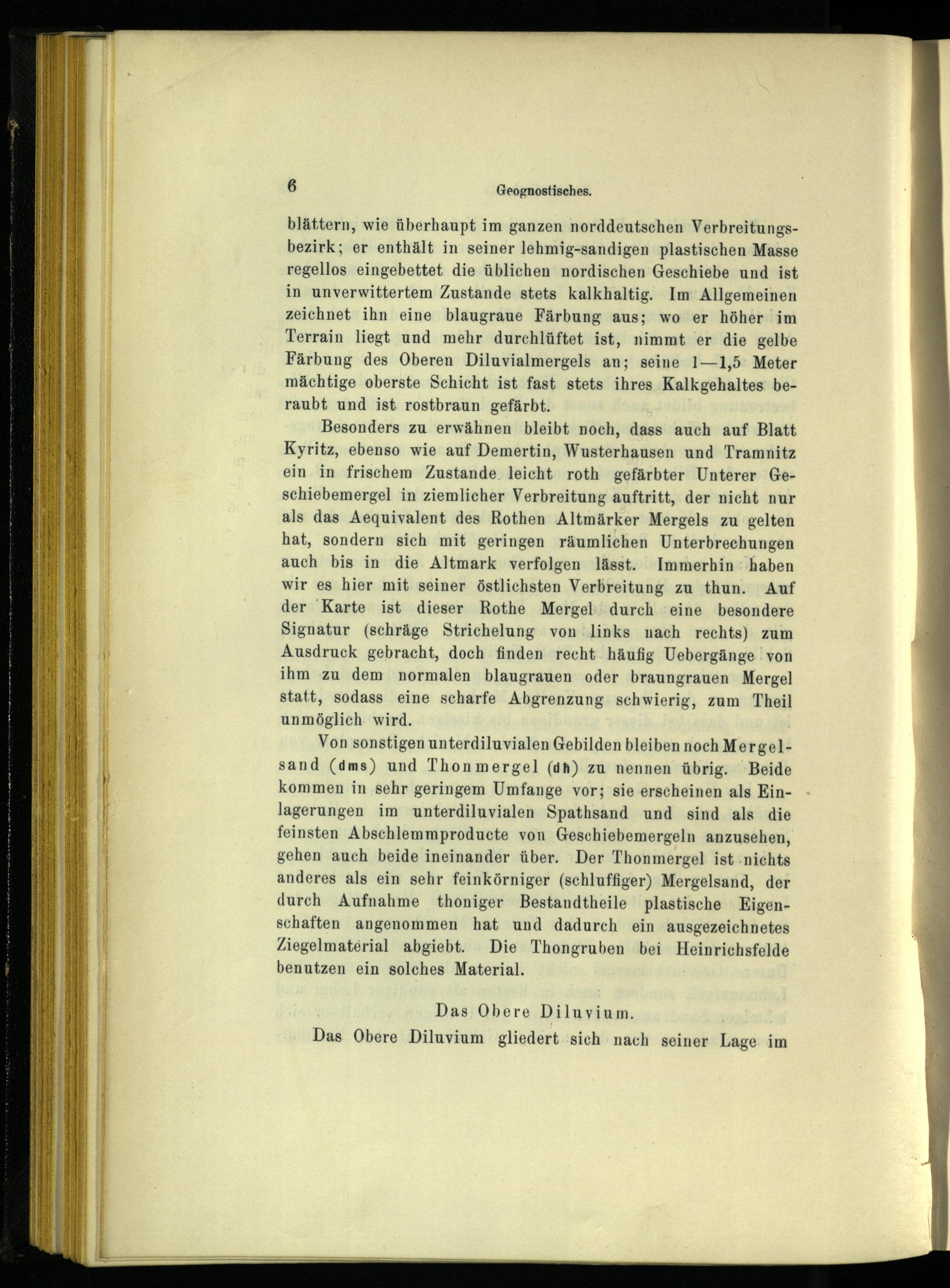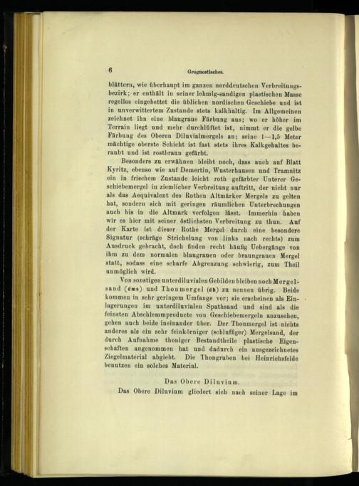 blättern, wie überhaupt im ganzen norddeutschen Verbreitungsbezirk; er enthält in seiner lehmig-sandigen plastischen Masse regellos eingebettet die üblichen nordischen Geschiebe und ist in unverwittertem Zustande stets kalkhaltig. Im Allgemeinen zeichnet ihn eine blaugraue Färbung aus; wo er höher im Terrain liegt und mehr durchlüftet ist, nimmt er die gelbe Färbung des Oberen Diluvialmergels an; seine 1—1,5' Meter mächtige oberste Schicht ist fast stets ihres Kalkgehaltes beraubt und ist rostbraun gefärbt.