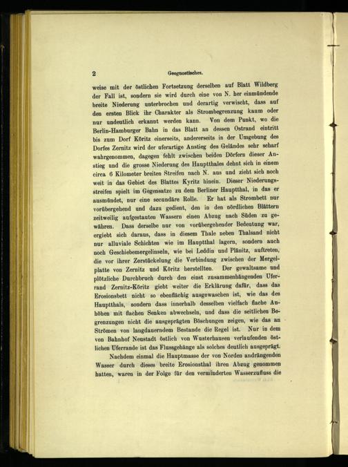 weise mit der östlichen Fortsetzung derselben auf Blatt Wildberg der Fall ist, sondern sie wird durch eine von N. her einmündende breite Niederung unterbrochen und derartig verwischt, dass auf den ersten Blick ihr Charakter als Strombegrenzung kaum oder nur undeutlich erkannt werden kann. Von dem Punkt, wo die Berlin-Hamburger Bahn in das Blatt an dessen Ostrand eintritt bis zum Dorf Köritz einerseits, andererseits in der Umgebung des Dorfes Zernitz wird der uferartige Anstieg des Geländes sehr scharf wahrgenommen, dagegen fehlt zwischen beiden Dörfern dieser Anstieg und die grosse Niederung des Hauptthales dehnt sich in einem eirea 6 Kilometer breiten Streifen nach N. aus und zieht sich noch weit in‘ das Gebiet des Blattes Kyritz hinein. Dieser‘ Niederungsstreifen spielt im Gegensatze zu dem Berliner Hauptthal, in das er ausmündet, nur eine secundäre Rolle. Er hat als Strombett nur vorübergehend und dazu gedient, den in den nördlichen Blättern zeitweilig aufgestauten Wassern einen Abzug nach Süden‘zu gewähren. Dass derselbe nur von vorübergehender Bedeutung war, ergiebt sich daraus, dass in diesem Thale neben Thalsand nicht nur alluviale Schichten wie im Hauptthal lagern, sondern auch noch Geschiebemergelinseln, wie bei Leddin und Plänitz, auftreten, die. vor ihrer Zerstückelung die Verbindung zwischen: der Mergelplatte von Zernitz und Köritz herstellten. Der gewaltsame und plötzliche: Durchbruch durch den einst zusammenhängenden Uferrand Zernitz-Köritz. giebt weiter die Erklärung dafür, dass das Erosionsbett nicht so ebenflächig ausgewaschen ist, wie das des Hauptthals, sondern dass innerhalb desselben vielfach flache Anhöhen‘ mit flachen Senken abwechseln, und dass die seitlichen Begrenzungen nicht die ausgeprägten Böschungen zeigen, wie das an Strömen von langdauerndem Bestande die Regel ist. Nur in dem von Bahnhof Neustadt östlich von Wusterhausen verlaufenden östlichen Uferrande ist das Flussgehänge als solches deutlich ausgeprägt.