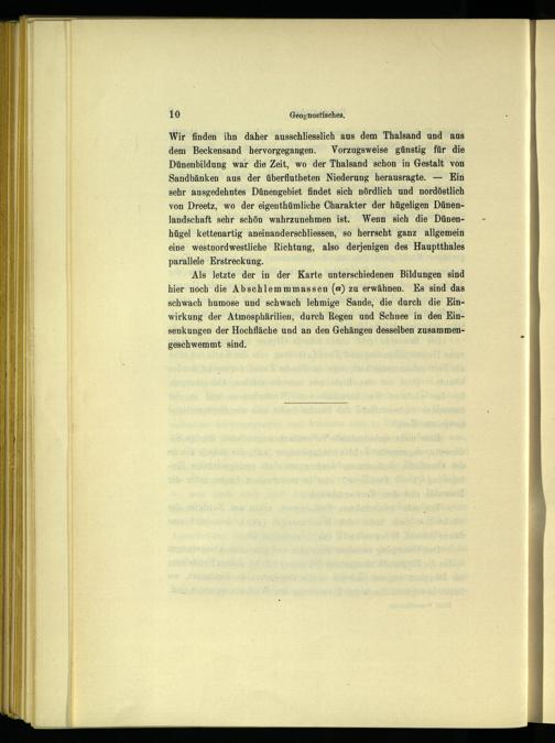 Als letzte der in der Karte unterschiedenen Bildungen sind hier noch die Abschlemmmassen(@) zu erwähnen. Es sind das schwach humose und schwach lehmige Sande, die durch die Einwirkung der Atmosphärilien, durch Regen und Schnee in den KEinsenkungen der Hochfläche und an den Gehängen desselben zusammengeschwemmt sind.
