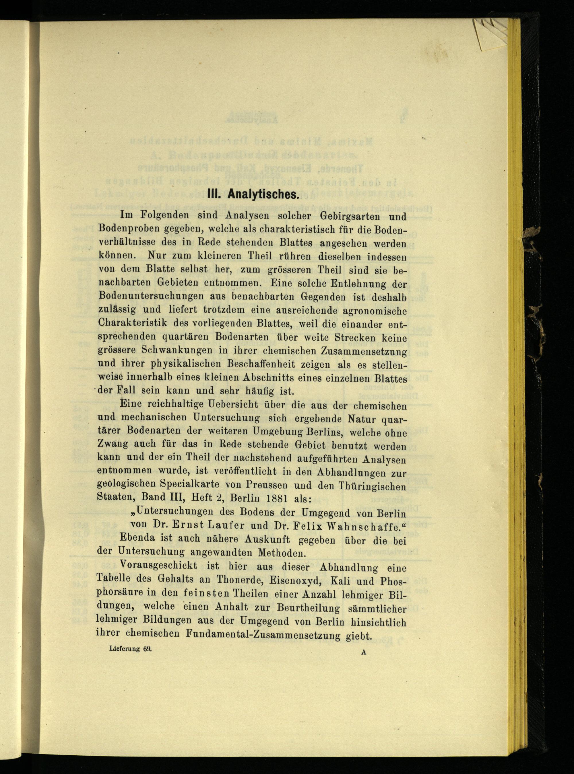 Eine reichhaltige Uebersicht über die aus der chemischen und mechanischen Untersuchung sich ergebende Natur quartärer Bodenarten der weiteren Umgebung Berlins, welche ohne Zwang auch für das in Rede stehende Gebiet benutzt werden kann und der ein Theil der nachstehend aufgeführten Analysen entnommen wurde, ist veröffentlicht in den Abhandlungen zur geologischen Specialkarte von Preussen und den Thüringischen Staaten, Band III, Heft 2, Berlin 1881 als: