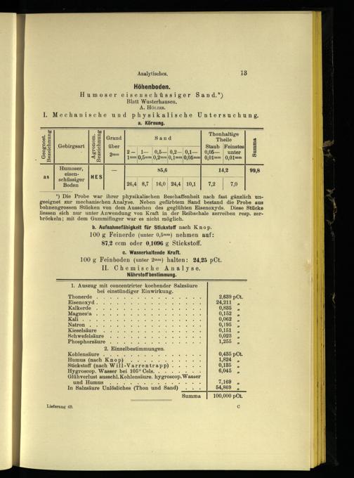 b. Aufnahmefähigkeit für Stickstoff nach Knop. 100 g Feinerde(unter 0,5»m) nehmen auf: 87,2 ccm oder 0,1096 g Stickstoff.