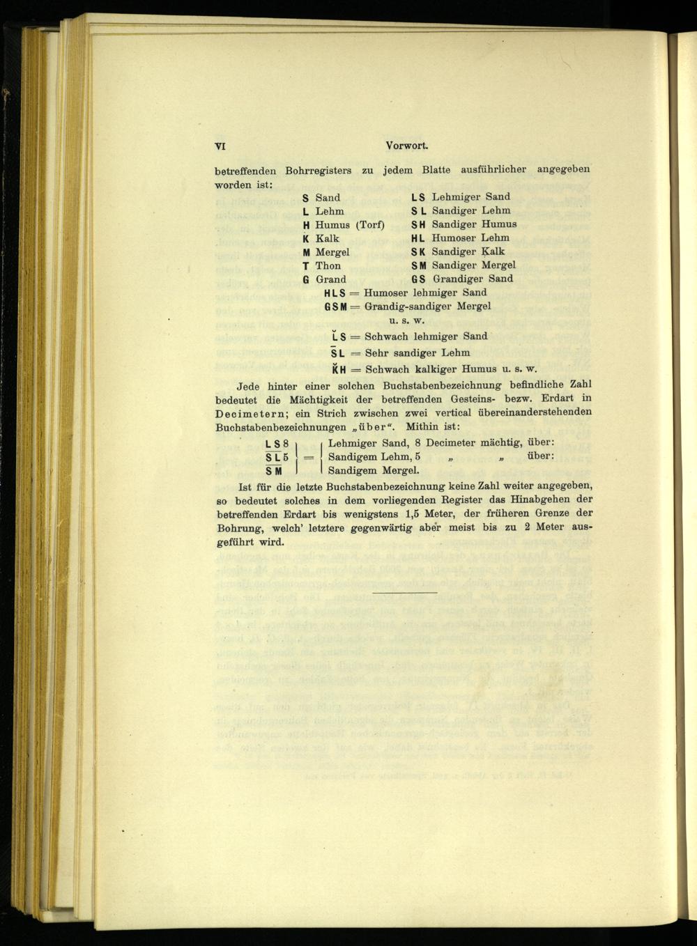 betreffenden Bohrregisters zu jedem Blatte ausführlicher angegeben worden ist: S Sand LS Lehmiger Sand L Lehm SL Sandiger Lehm H Humus(Torf) SH Sandiger Humus K Kalk HL Humoser Lehm M Mergel SK Sandiger Kalk T Thon SM Sandiger Mergel G Grand GS Grandiger Sand HLS— Humoser lehmiger Sand GSM= Grandig-sandiger Mergel U: 8. W.
