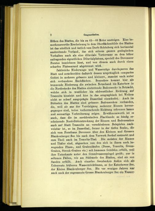Zahlreiche Niederungs- und Wasserzüge durchqueren das Blatt und zerschneiden dadurch dessen ursprünglich compactes Gebiet in mehrere grössere und kleinere, zumeist noch unter sich: verbundene Hochflächen. Besonders‘ kommt hier als trennende Niederung die zwischen Netzeband bis Katerbow: in die Nordostecke des Blattes eintretende Bodensenke in Betracht, welche sich in westlicher bis südwestlicher Richtung auf Tramnitz, hinzieht und hier in das orographisch bei Weitem nicht so scharf ausgeprägte Dossethal einmündet.‘ Auch im Südosten des Blattes sind grössere Bodensenken vorhanden, die, weil sie aus der: Vereinigung mehrerer Rinnen hervorgegangen sind, keine vorherrschende Richtung erkennen lassen und seenartige Verbreiterung zeigen. Erwähnenswerth ist es auch, dass die im norddeutschen Flachlande so’ häufig ‚erscheinende Nord-Süderstreckung der Rinnen und Bodensenken auch auf Blatt Tramnitz an verschiedenen Beispielen nachweisbar ist, so im Dossethal, ferner in der tiefen Senke, die sich vom Forsthaus Dovensee über den Kleinen und Grossen Blankenberger See bis nach.dem Vorwerk Seehof erstreckt und zum Theil auch im Temnitz-Thal. Die meisten der Rinnen und Thäler sind, abgesehen von den sich in ihnen noch bewegenden Fluss -, und Grabenläufen(Dosse, Temnitz, GrenzGraben, Strenk-Graben ete.) mit humosen Gebilden erfüllt, weil ihre Unterkante unter den Grundwasserspiegel greift; nur in seltenen Fällen, wie am Südrande: des Blattes,, sind sie von Sanden erfüllt. Auch einzelne Seenbecken finden sich.als Veberreste früheren Wasserreichthums, so der Katerbower See, der Kleine Blankenberger See. Bis, vor wenigen Jahren war auch noch der sogenannte Grosse Blankenberger See ein Wasser