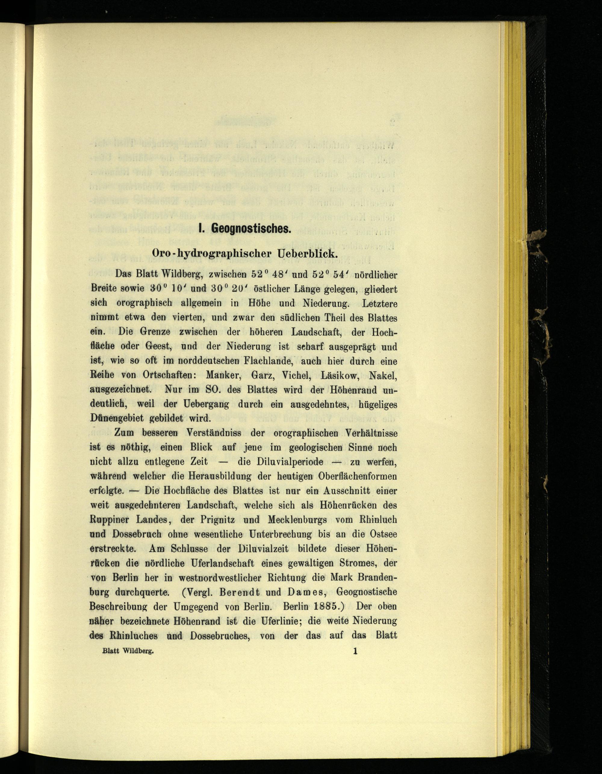 Zum besseren Verständniss der orographischen Verhältnisse ist es nöthig, einen Blick auf jene im geologischen Sinne noch nicht allzu entlegene Zeit— die Diluvialperiode— zu werfen, während welcher die Herausbildung der heutigen Oberflächenformen erfolgte.— Die Hochfläche des Blattes ist nur ein Ausschnitt einer weit ausgedehnteren Landschaft, welche sich als Höhenrücken des Ruppiner Landes, der Prignitz und Meecklenburgs vom Rhinluch und Dossebruch ohne wesentliche Unterbrechung bis an die Ostsee erstreckte. Am Schlusse der Diluvialzeit bildete dieser Höhenrücken die nördliche Uferlandschaft eines gewaltigen Stromes, der von Berlin her in westnordwestlicher Richtung die Mark Brandenburg durchquerte.(Vergl. Berendt und Dames, Geognostische Beschreibung der Umgegend von Berlin. Berlin 1885.) Der oben näher bezeichnete Höhenrand ist die Uferlinie; die weite Niederung des Rhinluches und Dossebruches, von der das auf das Blatt