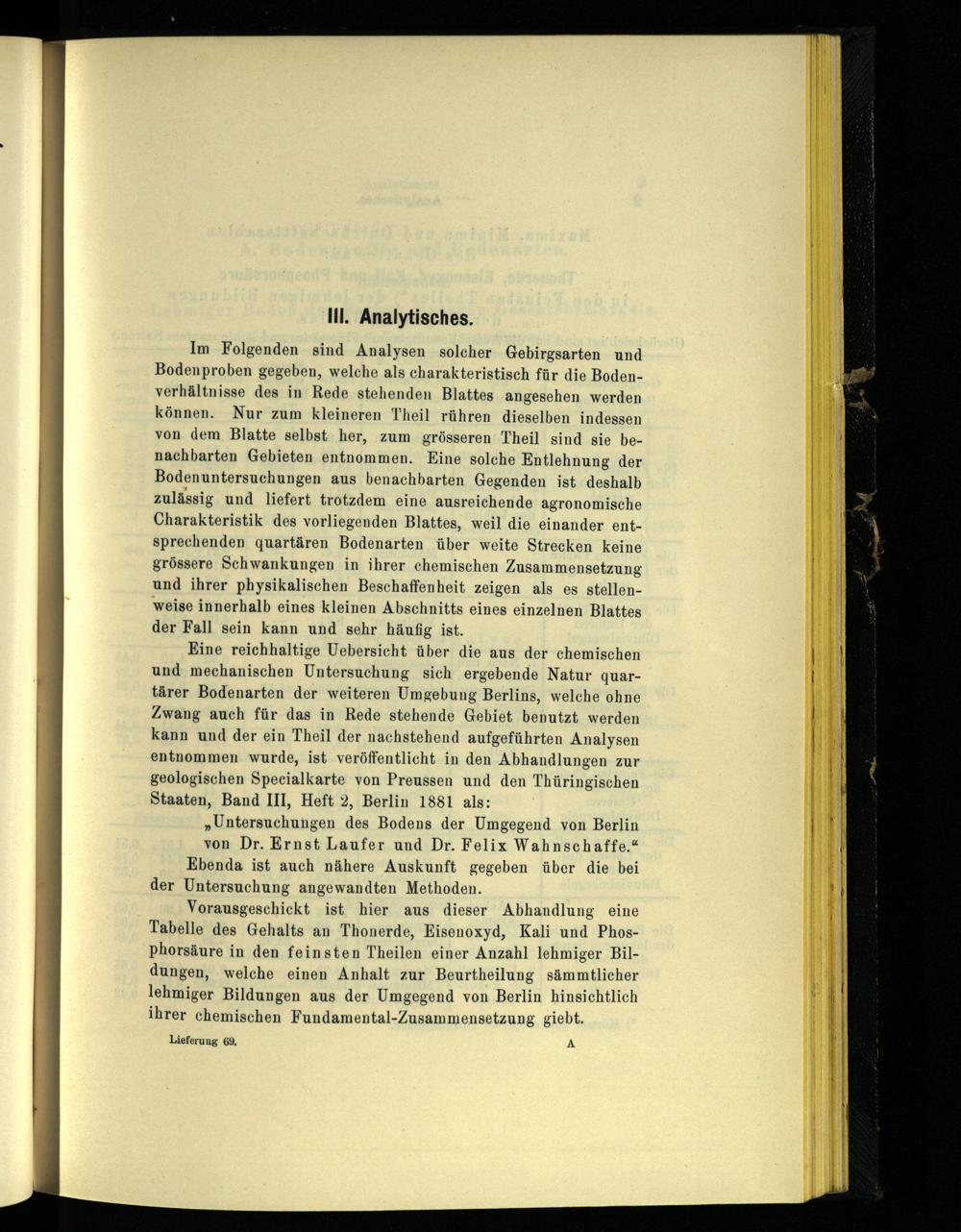 Eine reichhaltige Uebersicht über die aus der chemischen und mechanischen Untersuchung sich ergebende Natur quartärer Bodenarten der weiteren Umgebung Berlins, welche ohne Zwang auch für das in Rede stehende Gebiet benutzt werden kann und der ein Theil der nachstehend aufgeführten Analysen entnommen wurde, ist veröffentlicht in den Abhandlungen zur geologischen Specialkarte von Preussen und den Thüringischen Staaten, Band III, Heft 2, Berlin 1881 als: