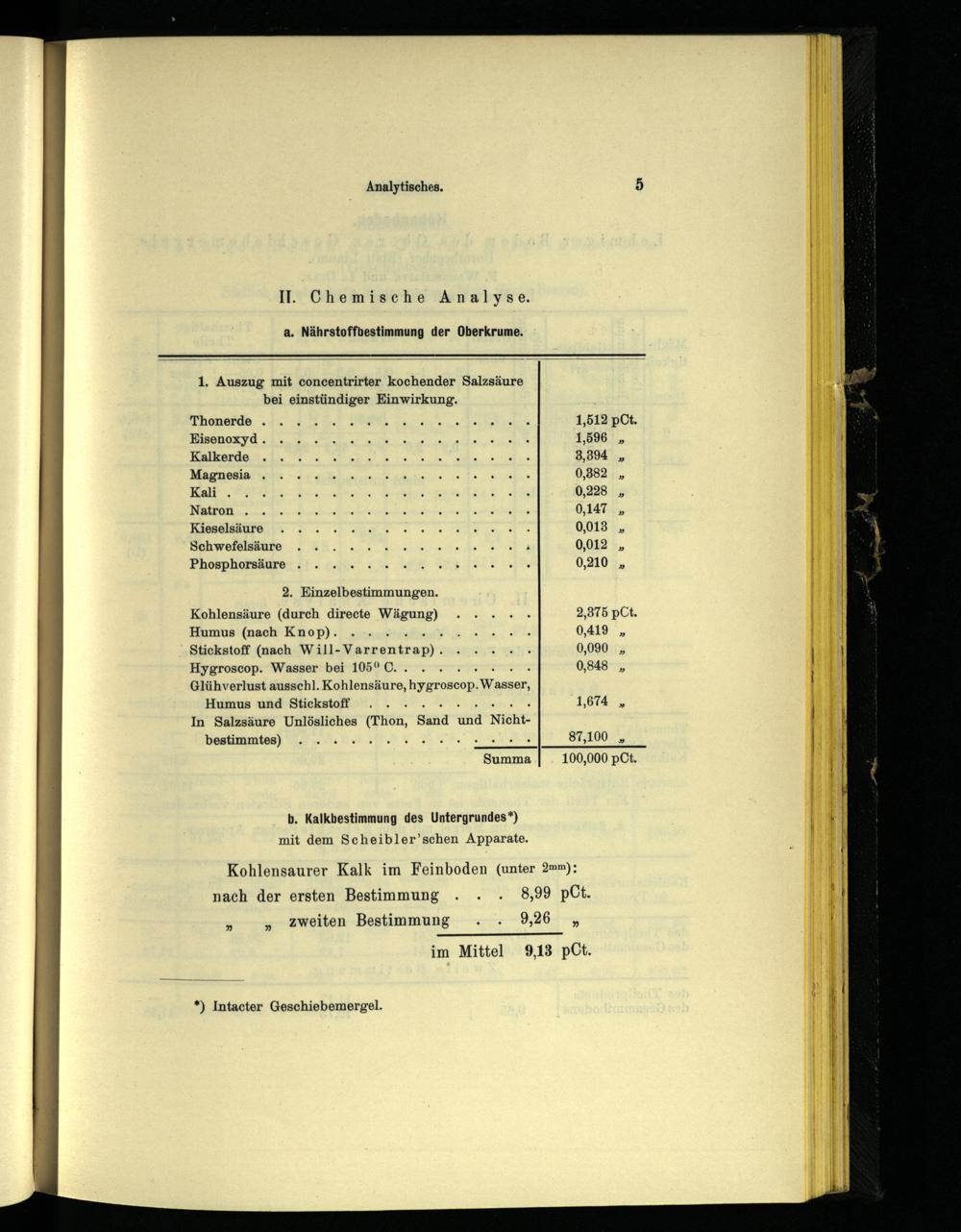 Kohlensäure(durch directe WESnE) VW 2,375 pCt. Humus(nach Knop)... Rn U 0,419 Stickstoff(nach Will- Varnentrap): VE U 0,090 Hygroscop. Wasser bei 105° C ya U 0,848 Glühverlust ausschl. Kohlensäure, hygroscop. Wasser,