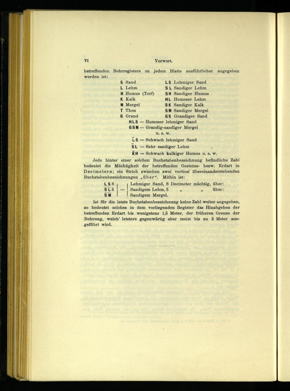Ist für die letzte Buchstabenbezeichnung keine Zahl weiter angegeben, so bedeutet solches in dem vorliegenden Register das Hinabgehen der betreffenden Erdart bis wenigstens 1,5 Meter, der früheren Grenze der Bohrung, welch’ letztere gegenwärtig aber meist bis zu 2 Meter ausgeführt wird.