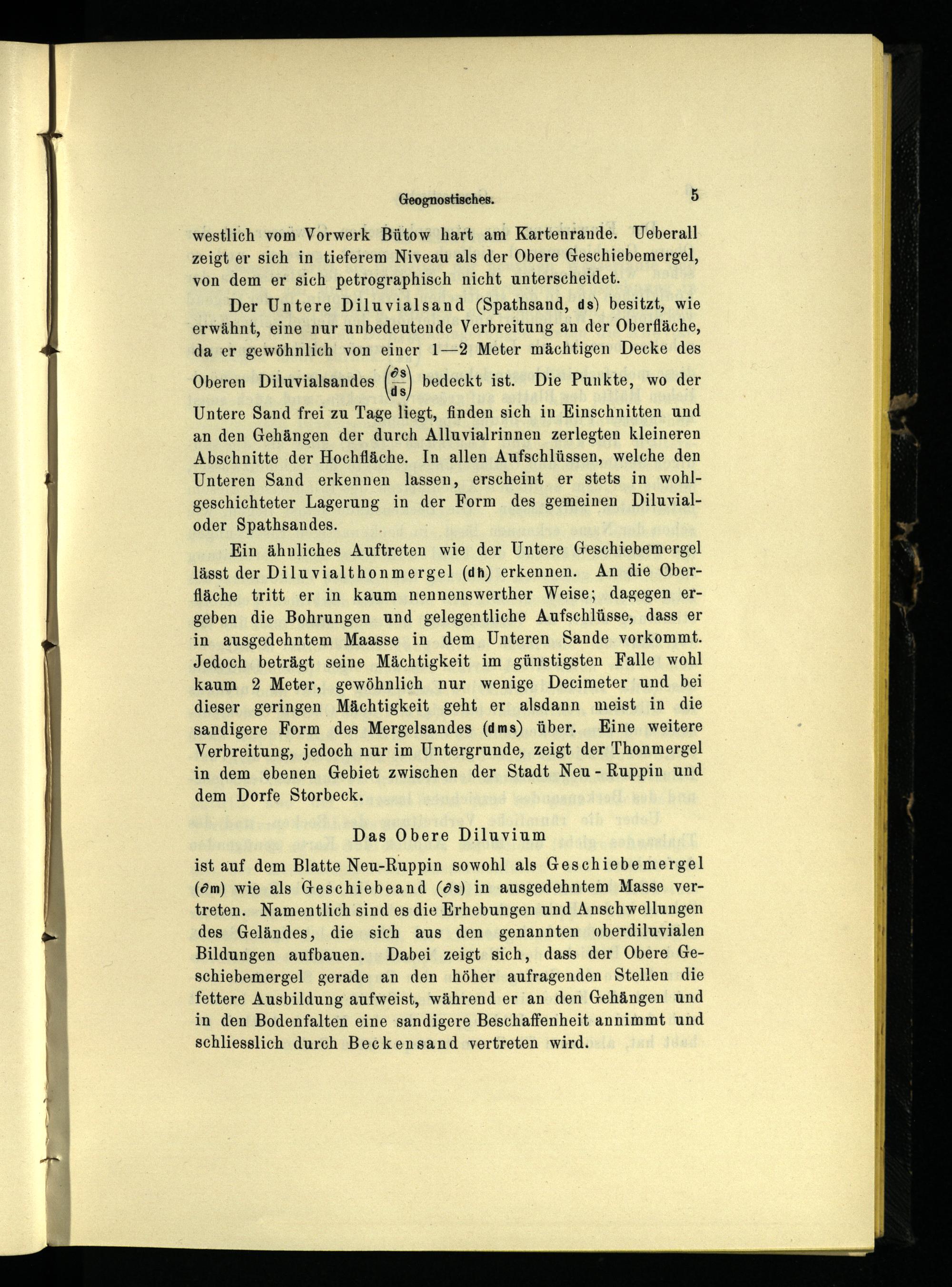 Ein ähnliches Auftreten wie der Untere Geschiebemergel lässt der Diluvialthonmergel(dh) erkennen. An die Oberfläche tritt er in kaum nennenswerther Weise; dagegen ergeben die Bohrungen und gelegentliche Aufschlüsse, dass er in ausgedehntem Maasse in dem Unteren Sande vorkommt. Jedoch beträgt seine Mächtigkeit im günstigsten Falle wohl kaum 2 Meter, gewöhnlich nur wenige Decimeter und bei dieser geringen Mächtigkeit geht er alsdann meist in die sandigere Form des Mergelsandes(dms) über. Eine weitere Verbreitung, jedoch nur im Untergrunde, zeigt der Thonmergel in dem ebenen Gebiet zwischen der Stadt Neu- Ruppin und dem Dorfe Storbeck.