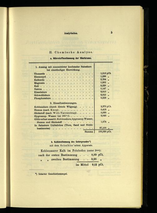 Kohlensäure(durch directe(a UN wie 2,375 pCt. Humus(nach Knop)..- Dt ea 0,419„ Stickstoff(nach W ill- N Varrentrap). dA al 0,090„ Hygroscop. Wasser bei 105° C SEN Can 0,848 Glühverlust ausschl. Kohlensäure, hygroscop. Wasser,