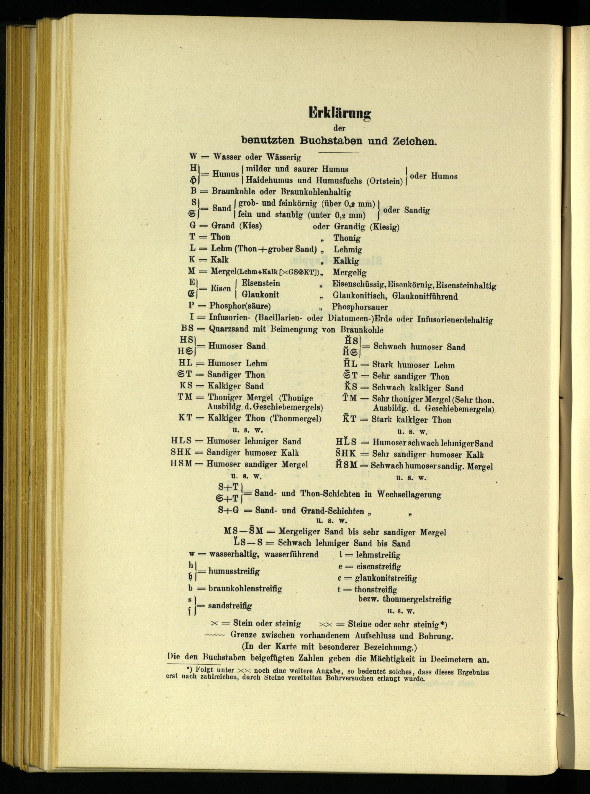 G= Grand(Kies) oder Grandig(Kiesig) T= Thon„ Thonig L= Lehm(Thon+grober Sand)„ Lehmig K= Kalk„ Kalkig M= Mergel(Lehm+Kalk[<GS@KT]), Mergelig | Eisenstein# Eisenschüssig, Eisenkörnig, Eisensteinhaltig | Glaukonit„ Glaukonitisch, Glaukonitführend P= Phosphor(säure)„ Phosphorsauer I= Infusorien-(Baecillarien- oder Diatomeen-)Erde oder Infusorienerdehaltig BS= Quarzsand mit Beimengung von Braunkohle HS HS HL= Humoser Lehm HL= Stark humoser Lehm ST= Sandiger Thon ST= Sehr sandiger Thon KS= Kalkiger Sand K$S= Schwach kalkiger Sand TM= Thoniger Mergel(Thonige TM= Sehr thoniger Mergel(Sehr thon. Ausbildg. d. Geschiebemergels) Ausbildg. d. Geschiebemergels) KT= Kalkiger Thon(Thonmergel) KT= Stark kalkiger Thon u. 8. W. u. 8. W. HLS= Humoser lehmiger Sand HLS= Humoser schwach lehmiger Sand SHK= Sandiger humoser Kalk SHK= Sehr sandiger humoser Kalk HSM= Humoser sandiger Mergel HSM= Schwach humosersandig. Mergel U. 8. W.| u. 8. W. S+T|. S+T| S+G= Sand- und Grand-Schichten„” u. 8. W.