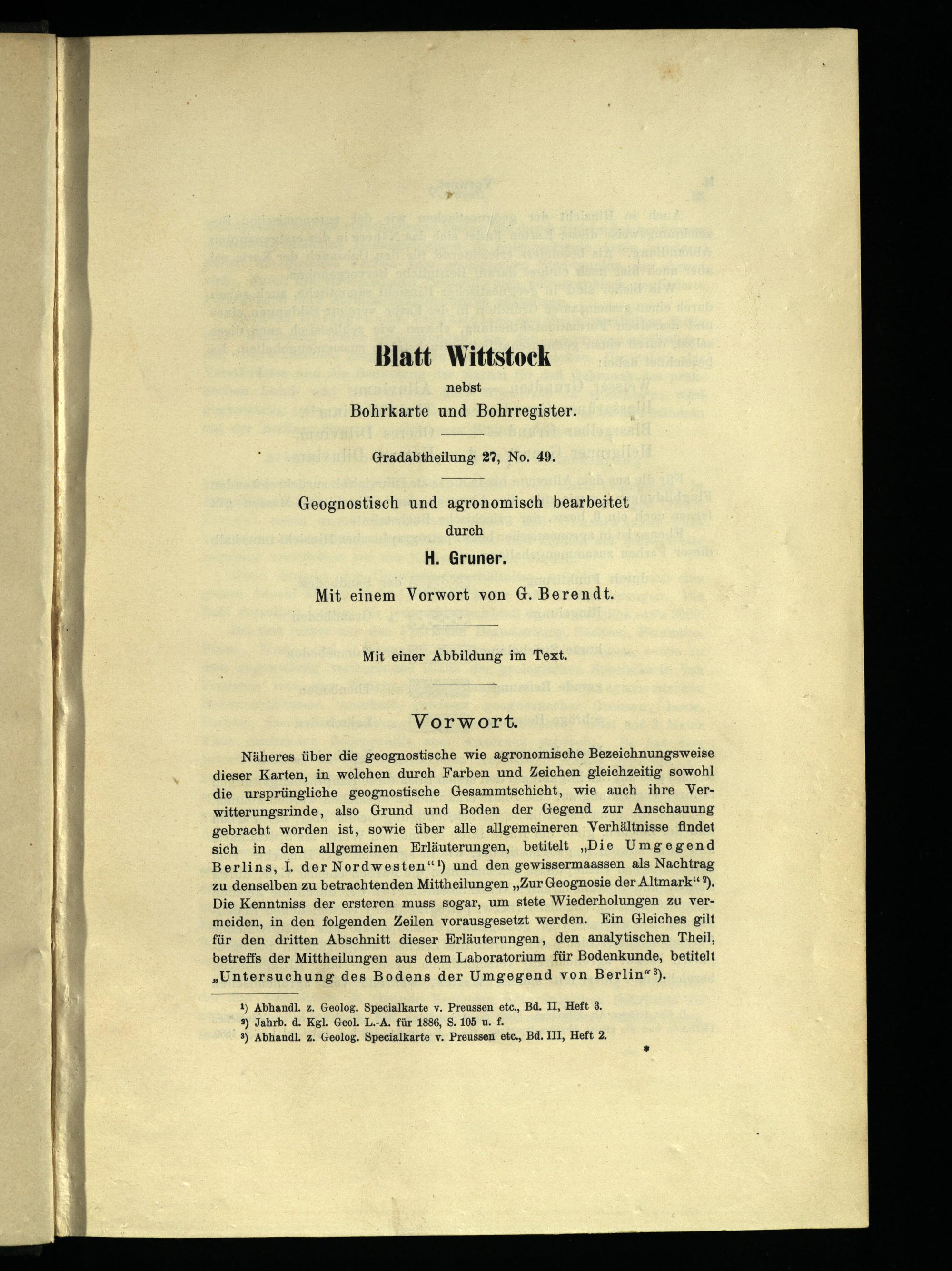 Näheres über die geognostische wie agronomische Bezeichnungsweise dieser Karten, in welchen durch Farben und Zeichen gleichzeitig sowohl die ursprüngliche geognostische Gesammtschicht, wie auch ihre Ver­witterungsrinde, also Grund und Boden der Gegend zur Anschauung gebracht worden ist, sowie über alle allgemeineren Verhältnisse findet sich in. den allgemeinen Erläuterungen, betiteltDie Umgegend Berlins , I. der Nordwesten!) und den gewissermaassen als Nachtrag zu denselben zu betrachtenden MittheilungenZur Geognosie der Altmark ?). Die Kenntniss der ersteren muss sogar, um stete Wiederholungen zu ver­meiden, in den folgenden Zeilen vorausgesetzt werden. Ein Gleiches gilt für den dritten Abschnitt dieser Erläuterungen, den analytischen Theil, betreffs der Mittheilungen aus dem Laboratorium für Bodenkunde, betitelt Untersuchung des Bodens der Umgegend von Berlin ).