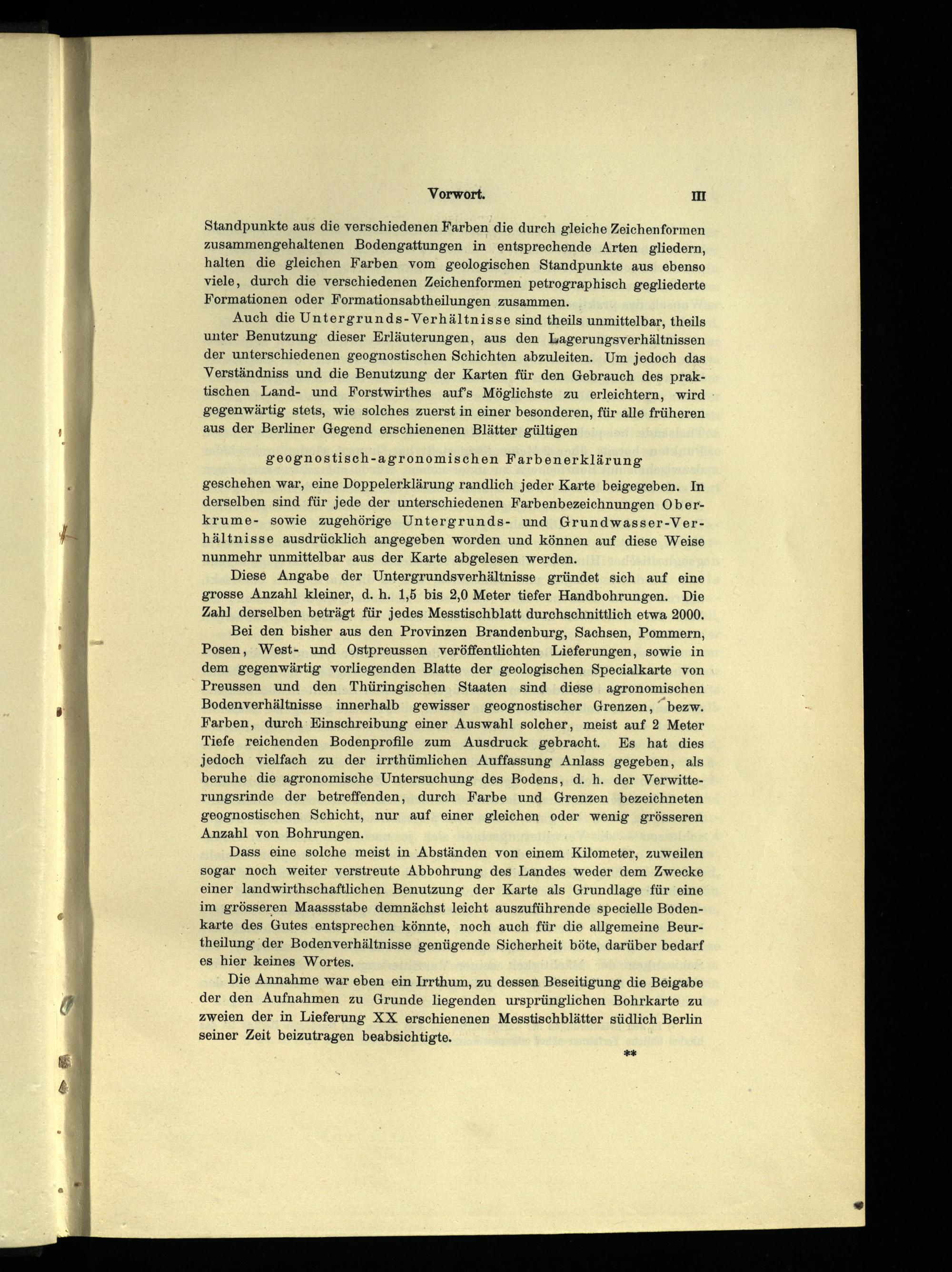 Bei den bisher aus den Provinzen Brandenburg , Sachsen , Pommern , Posen, West- und Ostpreussen veröffentlichten Lieferungen, sowie in dem gegenwärtig vorliegenden Blatte der geologischen Specialkarte von Preussen und den Thüringischen . Staaten sind diese agronomischen Bodenverhältnisse innerhalb gewisser geognostischer Grenzen,” bezw. Farben, durch Einschreibung einer Auswahl solcher, meist auf 2 Meter Tiefe reichenden Bodenprofile zum Ausdruck gebracht. Es hat dies jedoch vielfach zu der irrthümlichen Auffassung Anlass gegeben, als beruhe die agronomische Untersuchung des Bodens, d. h. der Verwitterungsrinde der betreffenden, durch Farbe und Grenzen bezeichneten geognostischen Schicht, nur auf einer gleichen oder wenig grösseren Anzahl von Bohrungen.