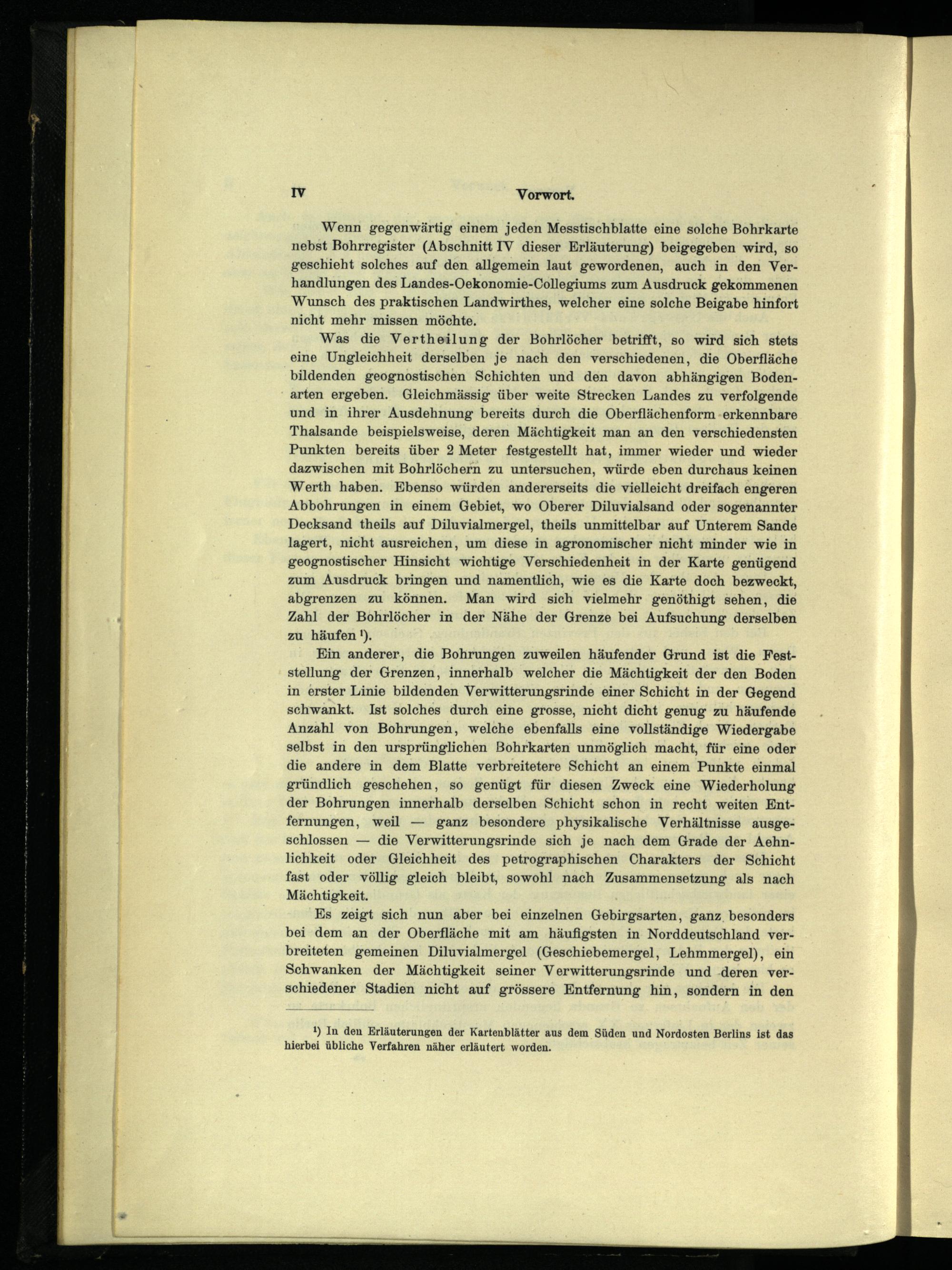 Was die Vertheilung der Bohrlöcher betrifft, so wird sich stets eine Ungleichheit derselben je nach den verschiedenen, die Oberfläche bildenden geognostischen Schichten und den davon abhängigen Bodenarten ergeben. Gleichmässig über weite Strecken Landes zu verfolgende und in ihrer Ausdehnung bereits durch die Oberflächenform-erkennbare Thalsande beispielsweise, deren Mächtigkeit man an den verschiedensten Punkten bereits über 2 Meter festgestellt hat, immer wieder und wieder dazwischen mit Bohrlöchern zu untersuchen, würde eben durchaus keinen Werth haben. Ebenso würden andererseits die vielleicht dreifach engeren Abbohrungen in einem Gebiet, wo Oberer Diluvialsand oder sogenannter Decksand theils auf Diluvialmergel, theils unmittelbar auf Unterem Sande lagert, nicht ausreichen, um diese in agronomischer nicht minder wie in geognostischer Hinsicht wichtige Verschiedenheit in der Karte genügend zum Ausdruck bringen und namentlich, wie es die Karte doch bezweckt, abgrenzen zu können. Man wird sich vielmehr genöthigt sehen, die Zahl der Bohrlöcher in der Nähe der Grenze bei Aufsuchung derselben zu häufen').