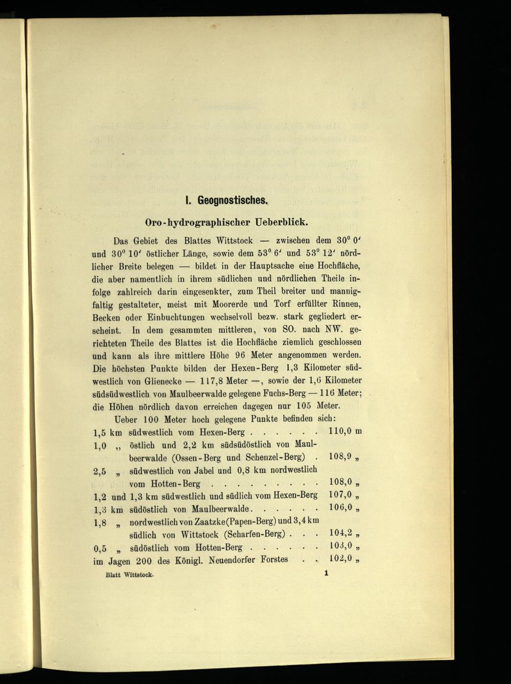 Das Gebiet des Blattes Wittstock — zwischen dem 30° 0‘ und 30° 10‘ östlicher Länge, sowie dem 53° 6‘ und 53° 12‘ nördlicher Breite belegen— bildet in der Hauptsache eine Hochfläche, die aber namentlich in ihrem südlichen und nördlichen Theile infolge zahlreich darin eingesenkter, zum Theil breiter und mannigfaltig gestalteter, meist mit Moorerde und Torf erfüllter Rinnen, Becken oder Einbuchtungen wechselvoll bezw. stark gegliedert erscheint. In dem gesammten mittleren, von SO. nach NW. gerichteten Theile des Blattes ist die Hochfläche ziemlich geschlossen und kann als ihre mittlere Höhe 96 Meter angenommen werden. Die höchsten Punkte bilden der Hexen-Berg 1,3 Kilometer südwestlich von Glienecke— 117,8 Meter—, sowie der 1,6 Kilometer südsüdwestlich von Maulbeerwalde gelegene Fuchs-Berg— 116 Meter; die Höhen nördlich davon erreichen dagegen nur 105 Meter.