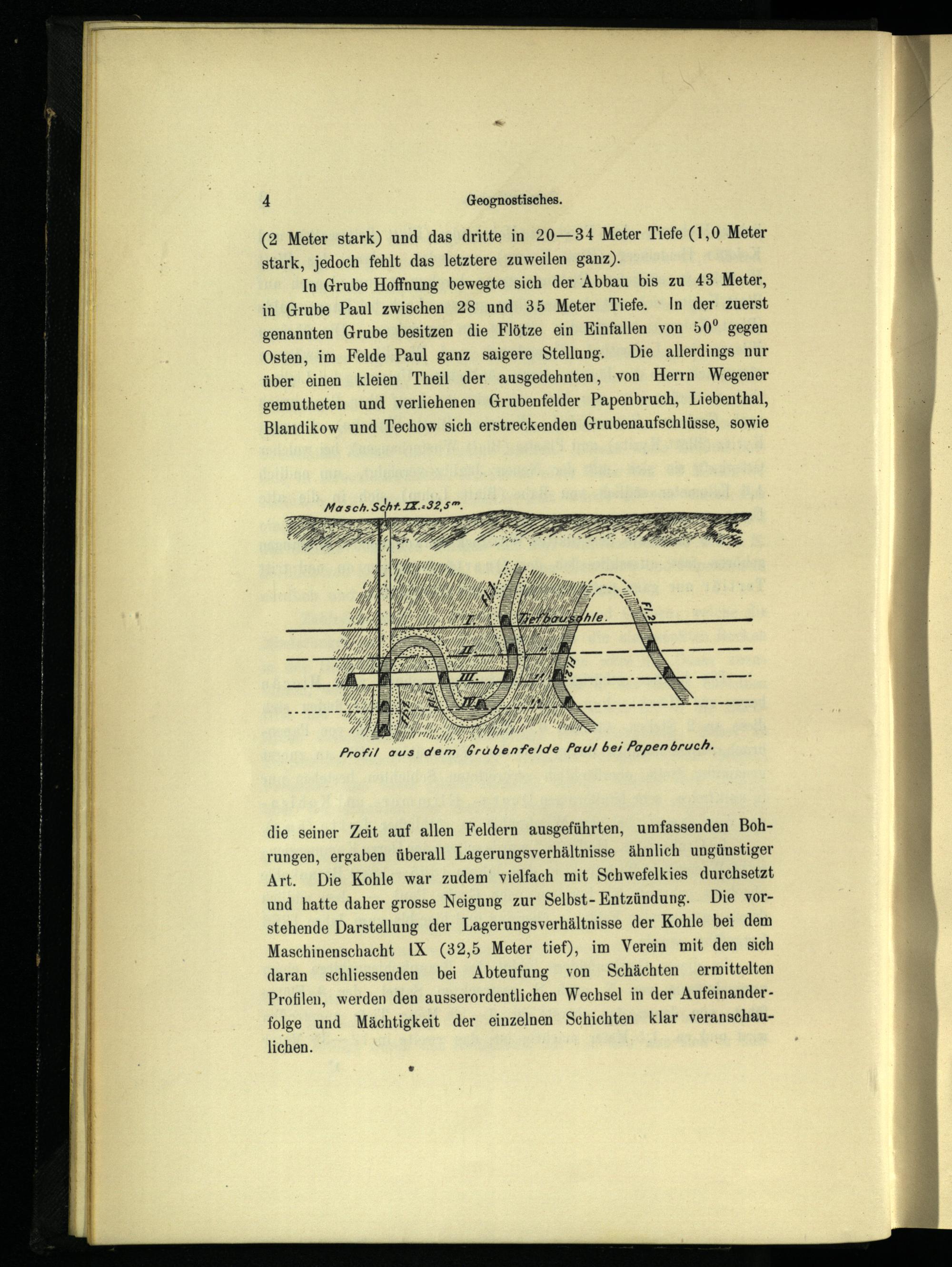 In Grube Hoffnung bewegte sich der Abbau bis zu 43 Meter, in Grube Paul zwischen 28 und 35 Meter Tiefe.‘ In der zuerst genannten Grube besitzen die Flötze ein Einfallen von 50° gegen Osten, im Felde Paul ganz saigere Stellung. Die allerdings nur über einen kleien. Theil der ausgedehnten, von Herrn Wegener gemutheten und verliehenen Grubenfelder Papenbruch, Liebenthal, Blandikow und Techow sich erstreckenden Grubenaufschlüsse, sowie