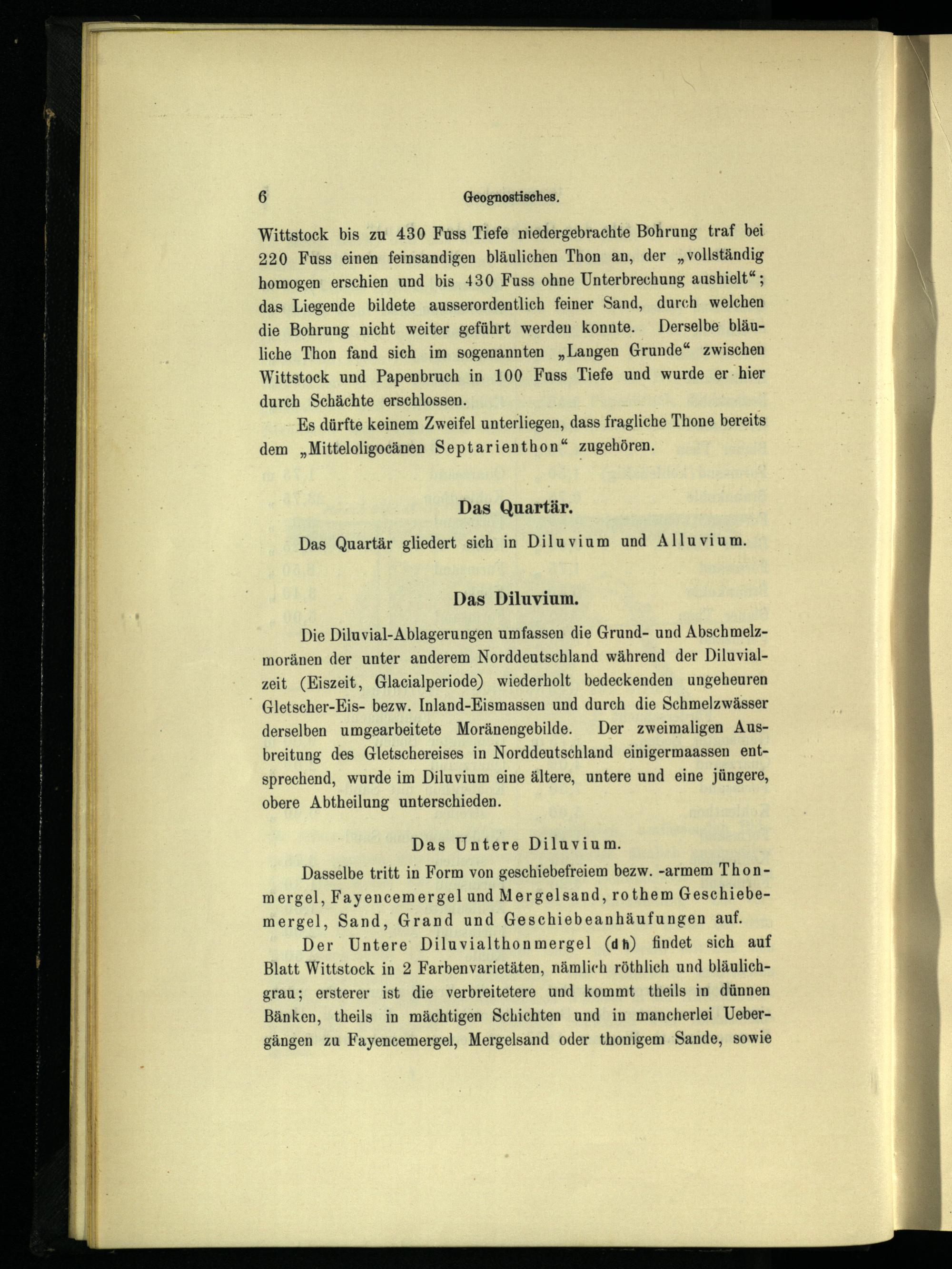Wittstock bis zu 430 Fuss Tiefe niedergebrachte Bohrung traf bei 220 Fuss einen feinsandigen bläulichen Thon an, der„vollständig homogen erschien und bis 430 Fuss ohne Unterbrechung aushielt“; das Liegende bildete ausserordentlich feiner Sand, durch welchen die Bohrung nicht weiter geführt werden konnte. Derselbe bläuliche Thon fand sich im sogenannten„Langen Grunde“ zwischen Wittstock und Papenbruch in 100 Fuss Tiefe und wurde er-hier durch Schächte erschlossen.