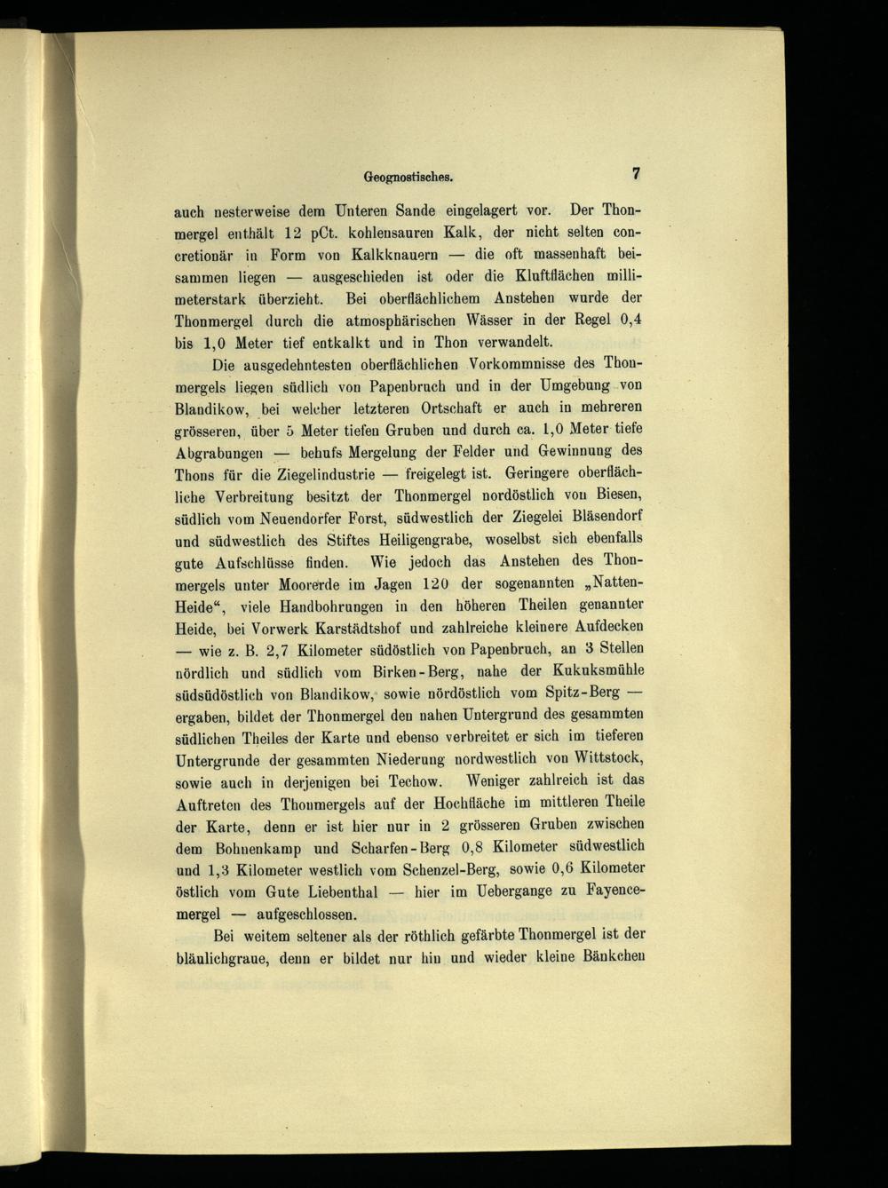 Die ausgedehntesten oberflächlichen Vorkommnisse des Thonmergels liegen südlich von Papenbruch und in der Umgebung.von Blandikow, bei welcher letzteren Ortschaft er auch in mehreren grösseren, über 5 Meter tiefen Gruben und durch ca. 1,0 Meter tiefe Abgrabungen— behufs Mergelung der Felder und Gewinnung des Thons für die Ziegelindustrie— freigelegt ist. Geringere oberflächliche Verbreitung besitzt. der Thonmergel nordöstlich von Biesen, südlich vom Neuendorfer Forst, südwestlich der Ziegelei Bläsendorf und südwestlich des Stiftes Heiligengrabe , woselbst sich ebenfalls gute Aufschlüsse finden. Wie jedoch das Anstehen des Thonmergels unter Moorerde im Jagen 120 der sogenannten„NattenHeide“, viele Handbohrungen in den höheren Theilen genannter Heide, bei Vorwerk Karstädtshof und zahlreiche kleinere Aufdecken — wie z. B. 2,7 Kilometer südöstlich von Papenbruch, an 3 Stellen nördlich und südlich vom Birken-Berg, nahe der Kukuksmühle südsüdöstlich von Blandikow, sowie nördöstlich vom Spitz-Berg— ergaben, bildet der Thonmergel den nahen Untergrund des gesammten südlichen Theiles der Karte und ebenso verbreitet er sich im tieferen Untergrunde der gesammten Niederung nordwestlich von Wittstock , sowie auch in derjenigen bei Techow. Weniger zahlreich ist das Auftreten des Thonmergels auf der Hochfläche im mittleren Theile der Karte, denn er ist hier nur in 2 grösseren Gruben zwischen dem Bohnenkamp und Scharfen-Berg 0,8 Kilometer südwestlich und 1,3 Kilometer westlich vom Schenzel-Berg, sowie 0,6 Kilometer östlich vom Gute Liebenthal— hier im Uebergange zu Fayencemergel— aufgeschlossen.