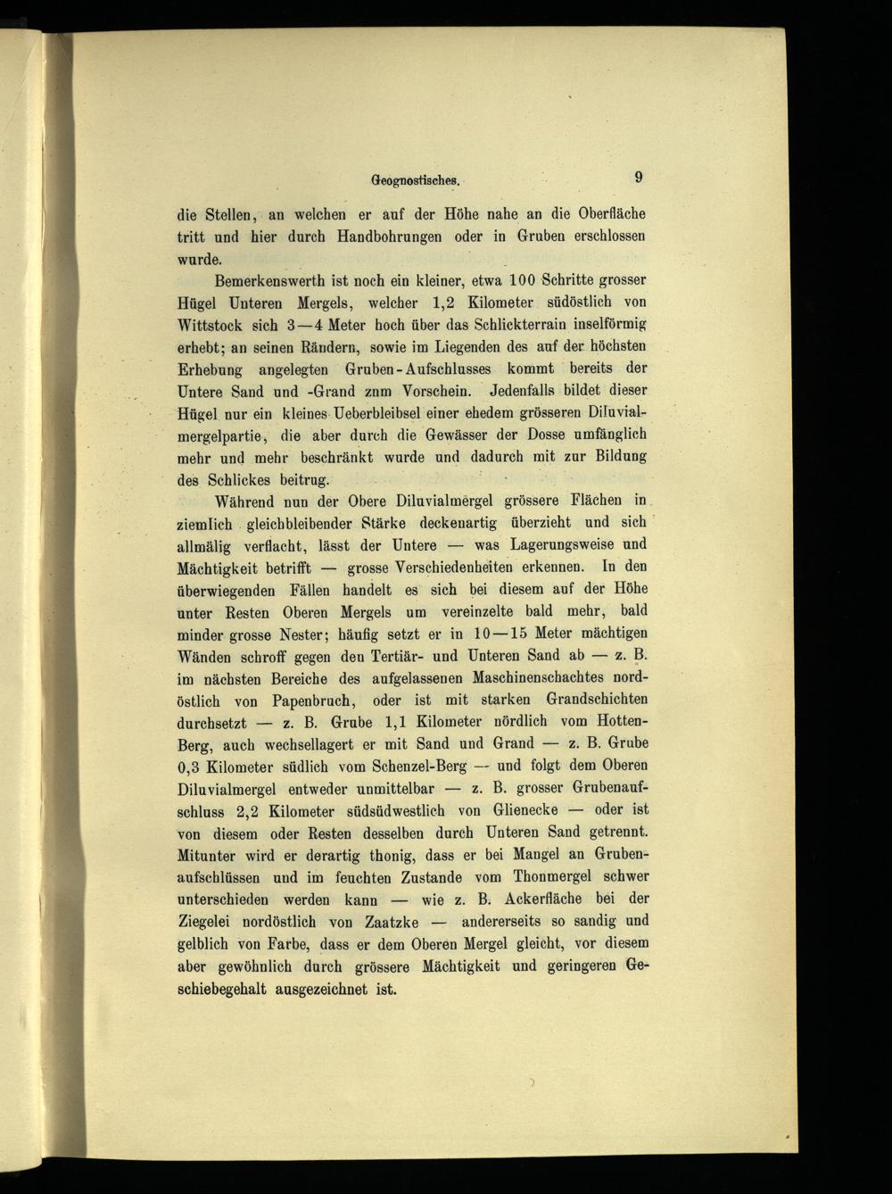 Bemerkenswerth ist noch ein kleiner, etwa 100 Schritte grosser Hügel Unteren Mergels, welcher 1,2 Kilometer südöstlich von Wittstock sich 3—4 Meter hoch über das Schlickterrain inselförmig erhebt; an seinen Rändern, sowie im Liegenden des auf der höchsten Erhebung angelegten Gruben- Aufschlusses kommt bereits der Untere Sand und-Grand zum Vorschein. Jedenfalls bildet dieser Hügel nur ein kleines. Ueberbleibsel einer ehedem grösseren Diluvialmergelpartie, die aber durch die Gewässer der Dosse umfänglich mehr und mehr beschränkt wurde und dadurch mit zur Bildung des Schlickes beitrug.: