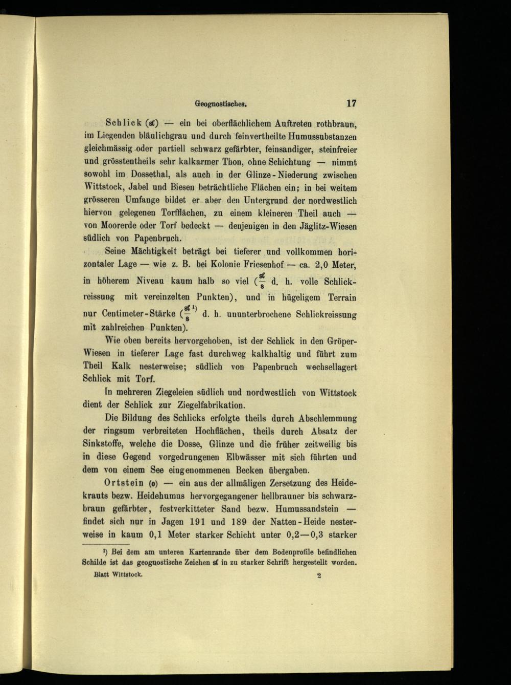 Schlick(st)— ein bei oberflächlichem Auftreten rothbraun, im Liegenden bläulichgrau und durch feinvertheilte Humussubstanzen gleichmässig oder partiell schwarz gefärbter, feinsandiger, steinfreier und grösstentheils sehr kalkarmer Thon, ohne Schichtung— nimmt sowohl im Dossethal, als auch in der Glinze- Niederung zwischen Wittstock , Jabel und Biesen beträchtliche Flächen ein; in bei weitem grösseren Umfange bildet er..aber. den Untergrund. der nordwestlich hiervon gelegenen Torfflächen, zu einem kleineren Theil auch— von Moorerde oder Torf bedeckt— denjenigen in den Jäglitz-Wiesen südlich von Papenbruch.