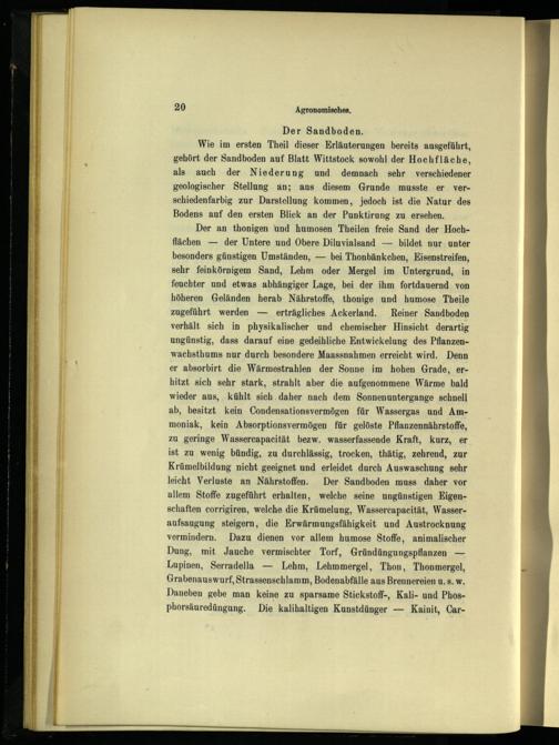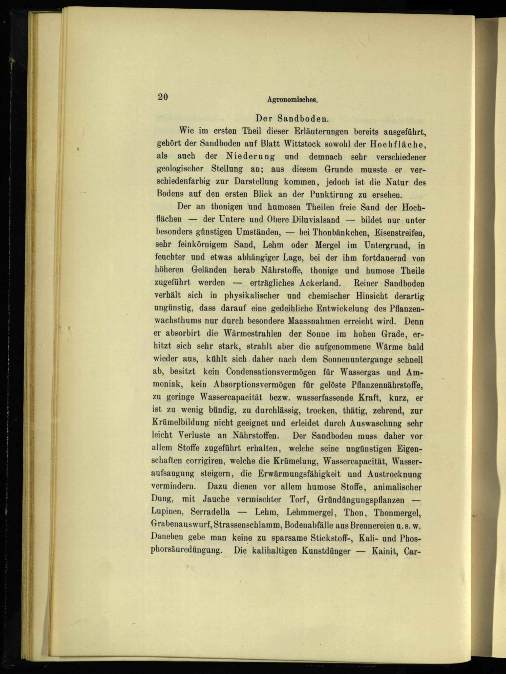 Der an thonigen und humosen Theilen freie Sand der Hoch flächen — der Untere und Obere Diluvialsand— bildet nur. unter besonders günstigen Umständen,— bei Thonbänkchen, Eisenstreifen, sehr feinkörnigem Sand, Lehm oder Mergel im Untergrund, in feuchter und etwas abhängiger Lage, bei der ihm fortdauernd von höheren Geländen herab Nährstoffe, thonige und humose Theile zugeführt werden— erträgliches Ackerland. Reiner Sandboden verhält sich in physikalischer und chemischer Hinsicht derartig ungünstig, dass darauf eine gedeihliche Entwickelung des Pflanzenwachsthums nur durch besondere Maassnahmen erreicht wird. Denn er absorbirt die Wärmestrahlen der Sonne im hohen Grade, erhitzt sich sehr stark, strahlt aber die aufgenommene Wärme bald wieder aus, kühlt sich.daher nach dem Sonnenuntergange schnell ab, besitzt kein Condensationsvermögen für Wassergas und Ammoniak, kein Absorptionsvermögen für gelöste Pflanzennährstoffe, zu geringe Wassercapacität bezw. wasserfassende Kraft, kurz, er ist zu wenig bündig, zu durchlässig, trocken, thätig, zehrend, zur Krümelbildung nicht geeignet und erleidet durch Auswaschung sehr leicht Verluste an Nährstoffen. Der Sandboden muss daher vor allem Stoffe zugeführt erhalten, welche seine ungünstigen Eigenschaften corrigiren, welche die Krümelung, Wassercapacität, Wasseraufsaugung steigern, die Erwärmungsfähigkeit und Austrocknung vermindern. Dazu dienen vor allem humose Stoffe, animalischer Dung, mit Jauche vermischter Torf, Gründüngungspflanzen— Lupinen, Serradella— Lehm, Lehmmergel, Thon, Thonmergel, Grabenauswurf, Strassenschlamm, Bodenabfälle aus Brennereien u. s. w. Daneben gebe man keine zu sparsame Stickstoff-, Kali- und Phosphorsäuredüngung. Die kalihaltigen Kunstdünger— Kainit, Car