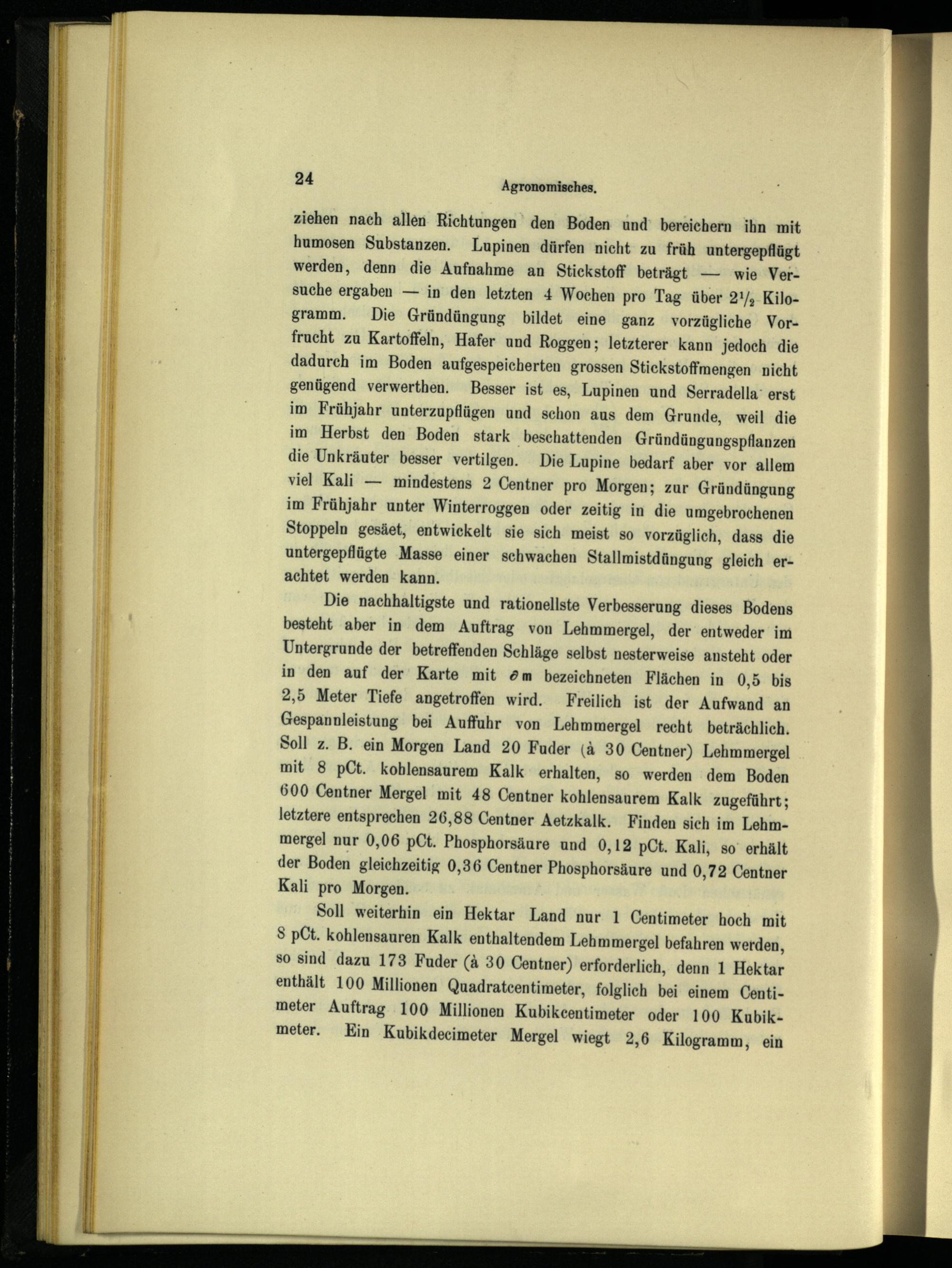 Soll weiterhin ein Hektar Land nur 1 Centimeter hoch mit S pCt. kohlensauren Kalk enthaltendem Lehmmergel befahren werden, so sind dazu 173 Fuder(4 30 Centner) erforderlich, denn 1 Hektar enthält 100 Millionen Quadratcentimeter, folglich bei einem Centimeter Auftrag 100 Millionen Kubikeentimeter oder 100 Kubikmeter. Ein Kubikdecimeter Mergel wiegt 2,6 Kilogramm, ein