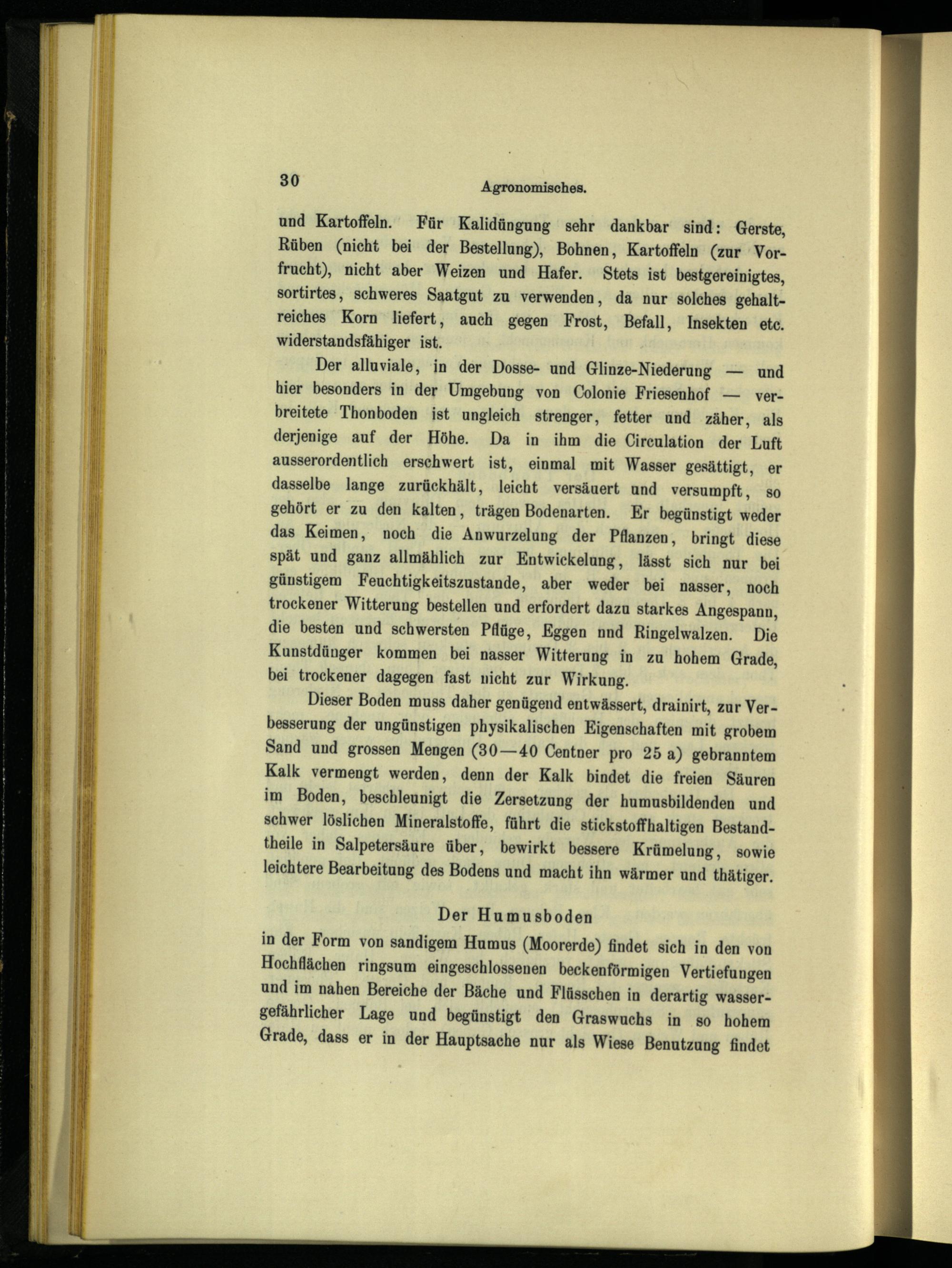 Der alluviale, in der Dosse- und Glinze-Niederung— und hier besonders in der Umgebung von Colonie Friesenhof— verbreitete Thonboden ist ungleich strenger, fetter und zäher, als derjenige auf der Höhe. Da in ihm die Cireulation der Luft ausserordentlich erschwert ist, einmal mit Wasser gesättigt, er dasselbe lange zurückhält, leicht versäuert und versumpft, so gehört er zu den kalten, trägen Bodenarten. Er begünstigt weder das Keimen, noch die Anwurzelung der Pflanzen, bringt diese spät und ganz allmählich zur Entwickelung, lässt sich nur bei günstigem Feuchtigkeitszustande, aber weder bei nasser, noch trockener Witterung bestellen und erfordert dazu starkes Angespann, die besten und schwersten Pflüge, Eggen nnd Ringelwalzen. Die Kunstdünger kommen bei nasser Witterung in zu hohem Grade, bei trockener dagegen fast nicht zur Wirkung.