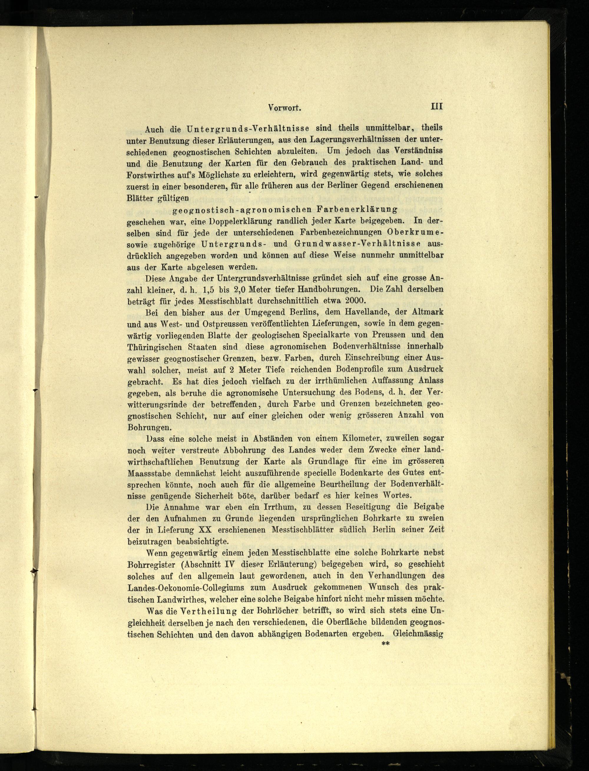 Bei den bisher aus der Umgegend Berlins , dem Havellande, der Altmark und aus West- und Ostpreussen veröffentlichten Lieferungen, sowie in dem gegenwärtig vorliegenden Blatte der geologischen Specialkarte von Preussen und den Thüringischen Staaten sind diese agronomischen Bodenverhältnisse innerhalb gewisser geognostischer Grenzen, bezw. Farben, durch Einschreibung einer Auswahl solcher, meist auf 2 Meter Tiefe reichenden Bodenprofile zum Ausdruck gebracht. Es hat dies jedoch vielfach zu der irrthümlichen Auffassung Anlass gegeben, als beruhe die agronomische Untersuchung des Bodens, d.h. der Verwitterungsrinde der betreffenden, durch Farbe und Grenzen bezeichneten geognostischen Schicht, nur auf einer gleichen oder wenig grösseren Anzahl von Bohrungen.