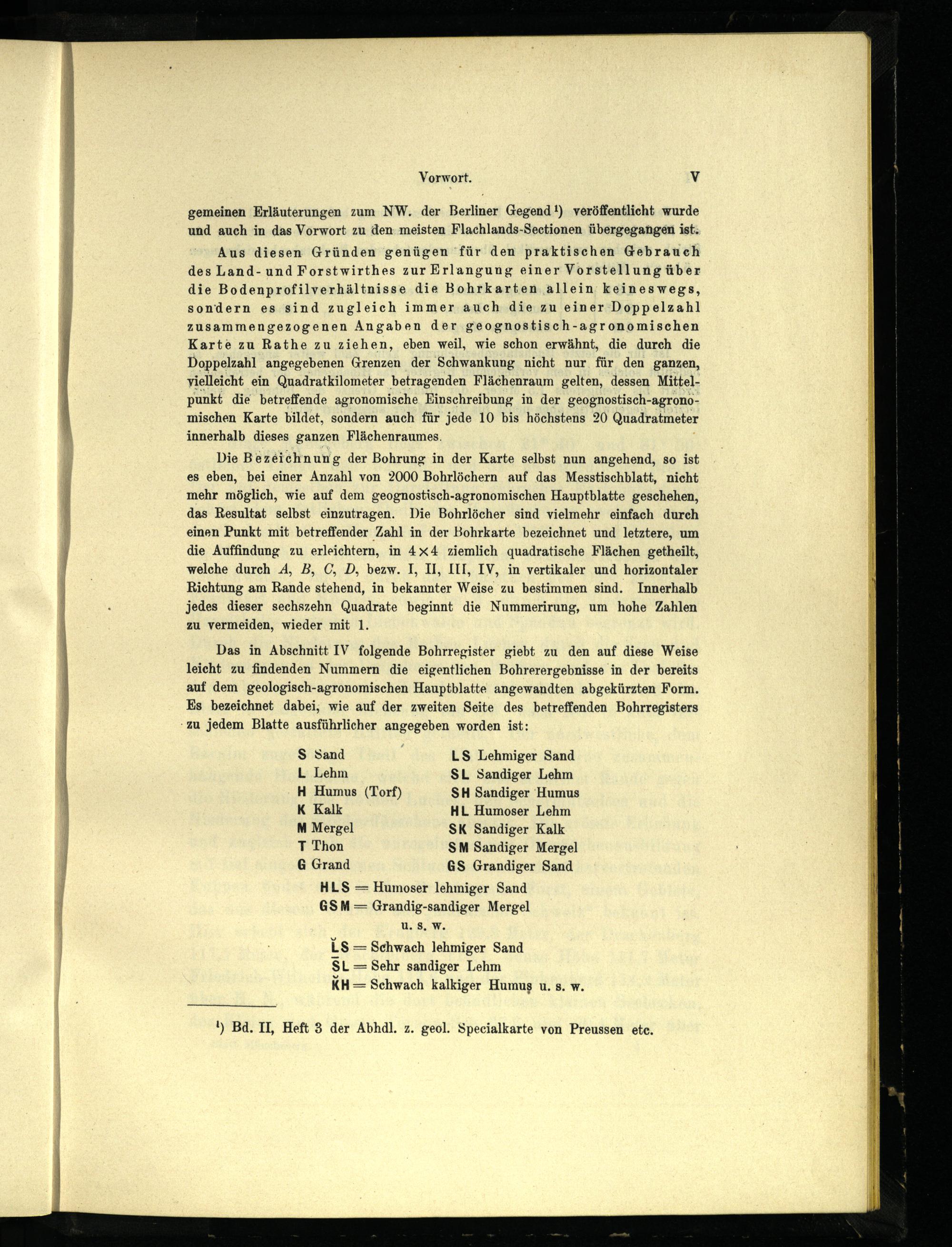 Das in Abschnitt IV folgende Bohrregister giebt zu den auf diese Weise leicht zu findenden Nummern die eigentlichen Bohrerergebnisse in der bereits auf dem geologisch-agronomischen Hauptblatte angewandten abgekürzten Form. Es bezeichnet dabei, wie auf der zweiten Seite des betreffenden Bohrregisters ‚zu jedem Blatte ausführlicher angegeben worden ist: