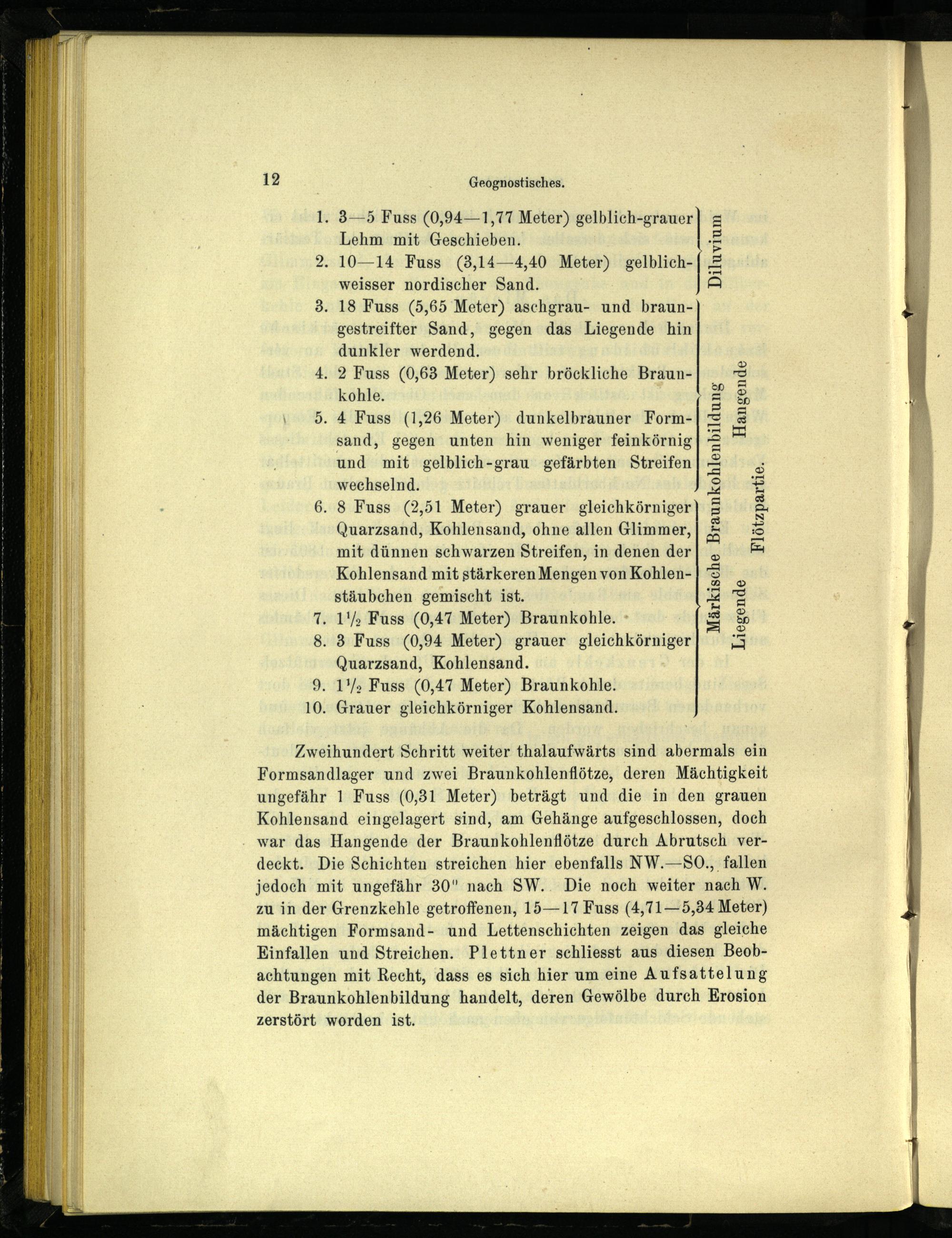 Zweihundert Schritt weiter thalaufwärts sind abermals ein Formsandlager und zwei Braunkohlenflötze, deren Mächtigkeit ungefähr 1 Fuss(0,31 Meter) beträgt und die in den grauen Kohlensand eingelagert sind, am Gehänge aufgeschlossen, doch war das Hangende der Braunkohlenflötze durch Abrutsch verdeckt. Die Schichten streichen hier ebenfalls NW.—SO., fallen jedoch mit ungefähr 30" nach SW.. Die noch weiter nach W. zu in der Grenzkehle getroffenen, 15—17 Fuss(4,71— 5,34 Meter) mächtigen Formsand- und Lettenschichten zeigen das gleiche Einfallen und Streichen. Plettner schliesst aus diesen Beobachtungen mit Recht, dass es sich hier um eine Aufsattelung der Braunkohlenbildung handelt, deren Gewölbe durch Erosion zerstört worden ist.
