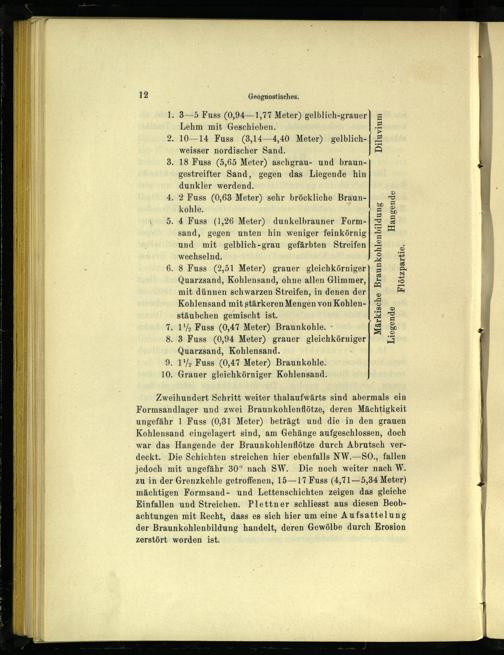 Quarzsand, Kohlensand. 9. 1’/2 Fuss(0,47 Meter) Braunkohle. 10. Grauer gleichkörniger Kohlensand.