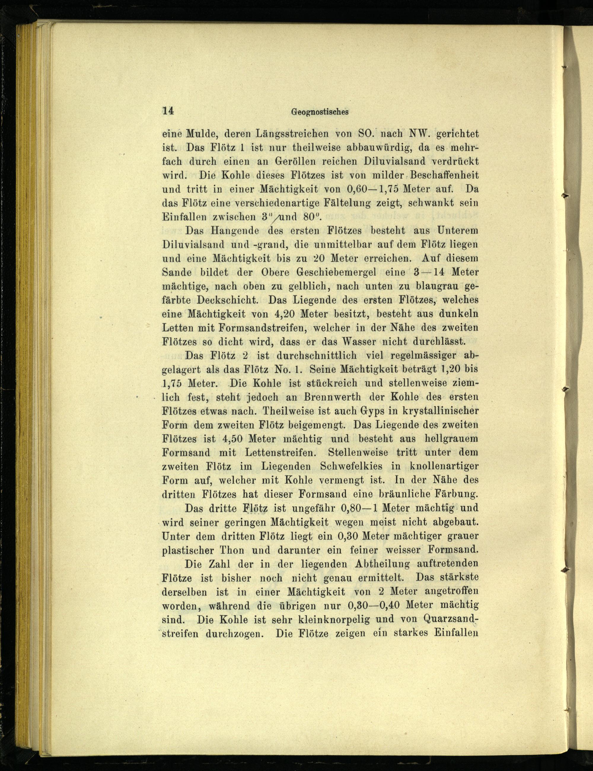eine Mulde, deren Längsstreichen von SO. nach NW. gerichtet ist. Das Flötz 1 ist nur theilweise abbauwürdig, da es. mehrfach durch einen an Geröllen reichen Diluvialsand verdrückt wird. Die Kohle.dieses Flötzes ist von milder. Beschaffenheit und tritt in einer Mächtigkeit von 0,60—1,75 Meter auf. Da das Flötz eine verschiedenartige Fältelung zeigt, schwankt sein Einfallen zwischen 3” und 80°.