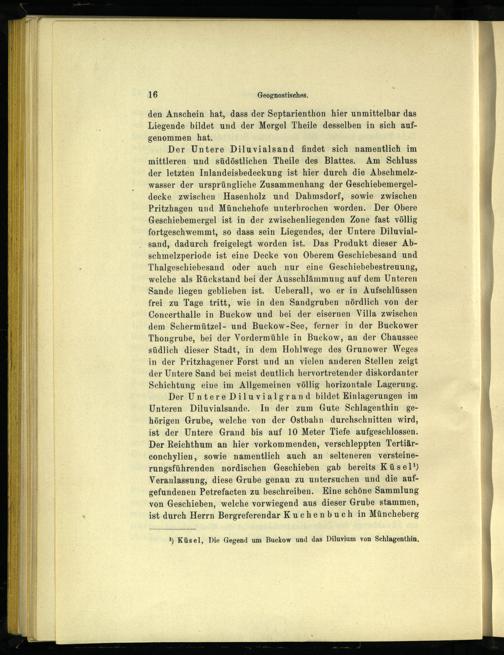 Der Untere Diluvialgrand bildet Einlagerungen im Unteren Diluvialsande. In der zum Gute Schlagenthin gehörigen Grube, welche von der Ostbahn durchschnitten wird, ist der Untere Grand bis auf 10 Meter Tiefe aufgeschlossen. Der Reichthum an hier vorkommenden, verschleppten Tertiärconchylien, sowie namentlich auch an selteneren versteinerungsführenden nordischen Geschieben gab bereits Küsel') Veranlassung, diese Grube genau zu untersuchen und die aufgefundenen Petrefacten zu beschreiben. Eine schöne Sammlung von Geschieben, welche vorwiegend aus dieser Grube stammen, ist durch Herrn Bergreferendar Kuchen buch in Müncheberg