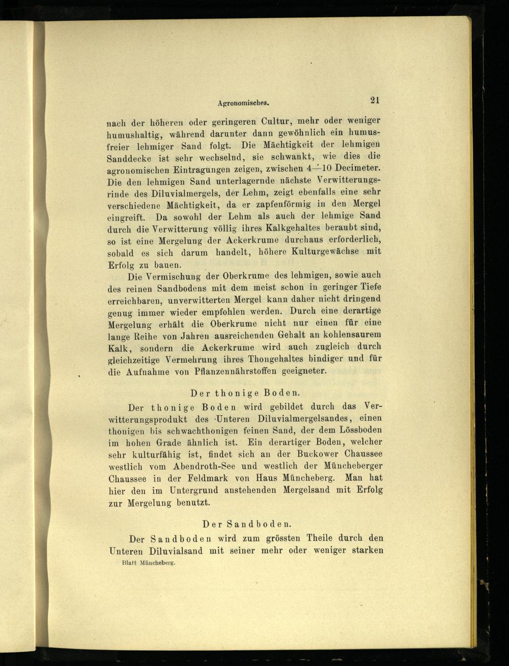 Der thonige Boden wird gebildet durch das Verwitterungsprodukt des-Unteren Diluvialmergelsandes, einen thonigen bis schwachthonigen feinen Sand, der dem Lössboden im hohen Grade ähnlich ist. Ein derartiger Boden, welcher sehr kulturfähig ist, findet sich an der Buckower Chaussee westlich vom Abendroth-See und westlich der Müncheberger Chaussee in der Feldmark von Haus Müncheberg . Man hat hier den im Untergrund anstehenden Mergelsand mit Erfolg zur Mergelung benutzt.