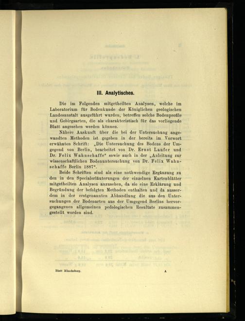 Beide Schriften sind als eine nothwendige Ergänzung zu den in den Specialerläuterungen der einzelnen Kartenblätter mitgetheilten Analysen anzusehen, da sie eine Erklärung und Begründung der befolgten Methoden enthalten und da ausserdem in der erstgenannten Abhandlung die aus den Untersuchungen der Bodenarten aus der Umgegend Berlins hervorgegangenen allgemeinen pedologischen Resultate zusammengestellt worden sind.