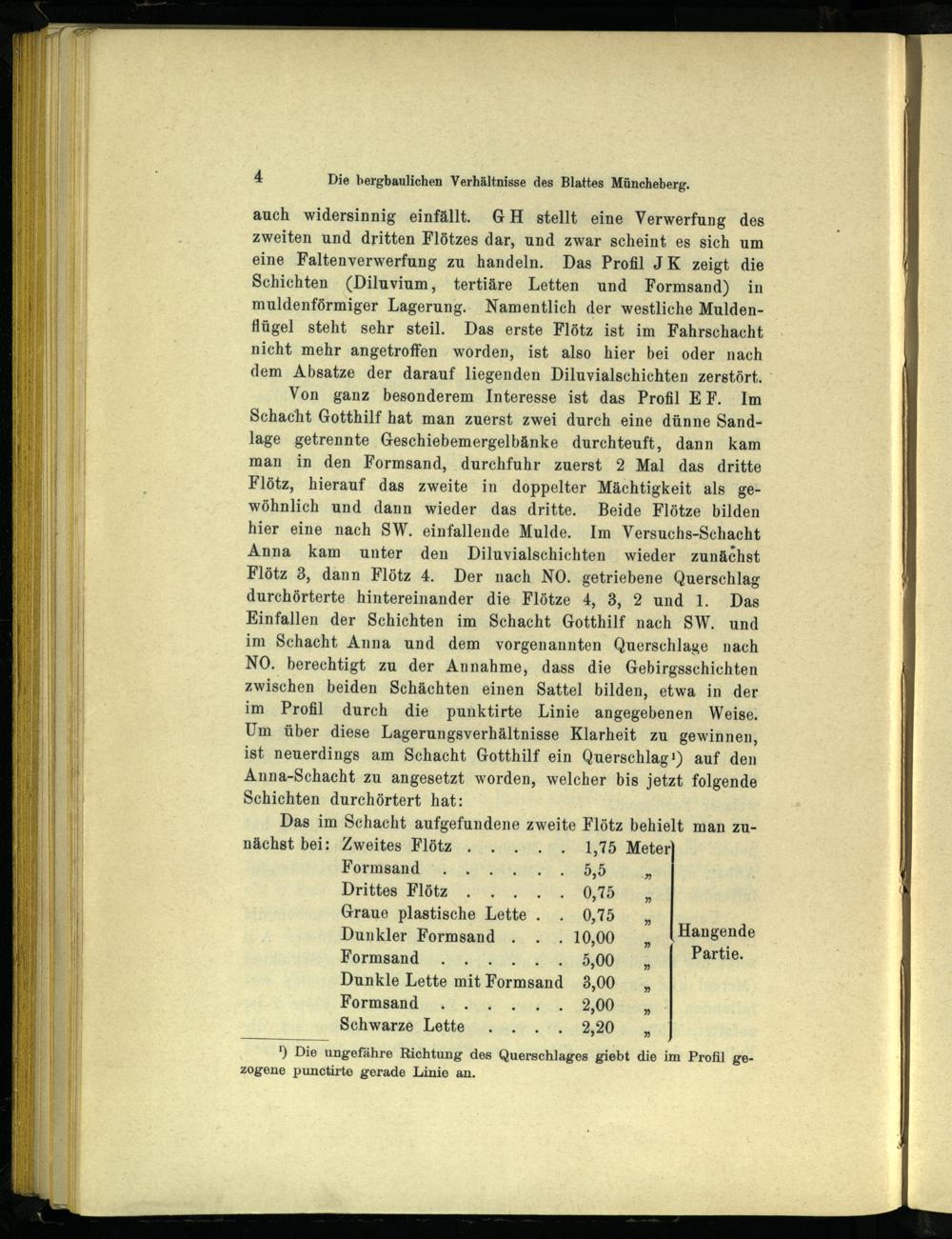 auch widersinnig einfällt. GH stellt eine Verwerfung des zweiten und dritten Flötzes dar, und zwar scheint es sich um eine Faltenverwerfung zu handeln. Das Profil JK zeigt die Schichten(Diluvium, tertiäre Letten und Formsand) in muldenförmiger Lagerung. Namentlich der westliche Muldenflügel steht sehr steil. Das erste Flötz ist im Fahrschacht nicht mehr angetroffen worden, ist also hier bei oder nach dem Absatze der darauf liegenden Diluvialschichten zerstört. Von ganz besonderem Interesse ist das Profil EFF. Im Schacht Gotthilf hat man zuerst zwei durch eine dünne Sandlage getrennte Geschiebemergelbänke durchteuft, dann kam man in den Formsand, durchfuhr zuerst 2 Mal das dritte Flötz, hierauf das zweite in doppelter Mächtigkeit als gewöhnlich und dann wieder das dritte. Beide Flötze bilden hier eine nach SW. einfallende Mulde. Im Versuchs-Schacht Anna kam unter den Diluvialschichten wieder zunächst Flötz 3, dann Flötz 4. Der nach NO. getriebene Querschlag durchörterte hintereinander die Flötze 4, 3, 2 und 1. Das Einfallen der Schichten im Schacht Gotthilf nach SW. und im Schacht Anna und dem vorgenannten Querschlage nach NO. berechtigt zu der Annahme, dass die Gebirgsschichten zwischen beiden Schächten einen Sattel bilden, etwa in der im Profil durch die punktirte Linie angegebenen Weise. Um über diese Lagerungsverhältnisse Klarheit zu gewinnen, ist neuerdings am Schacht Gotthilf ein Querschlag!) auf den Anna-Schacht zu angesetzt worden, welcher bis jetzt folgende Schichten durchörtert hat: Das im Schacht aufgefundene zweite Flötz behielt man zu