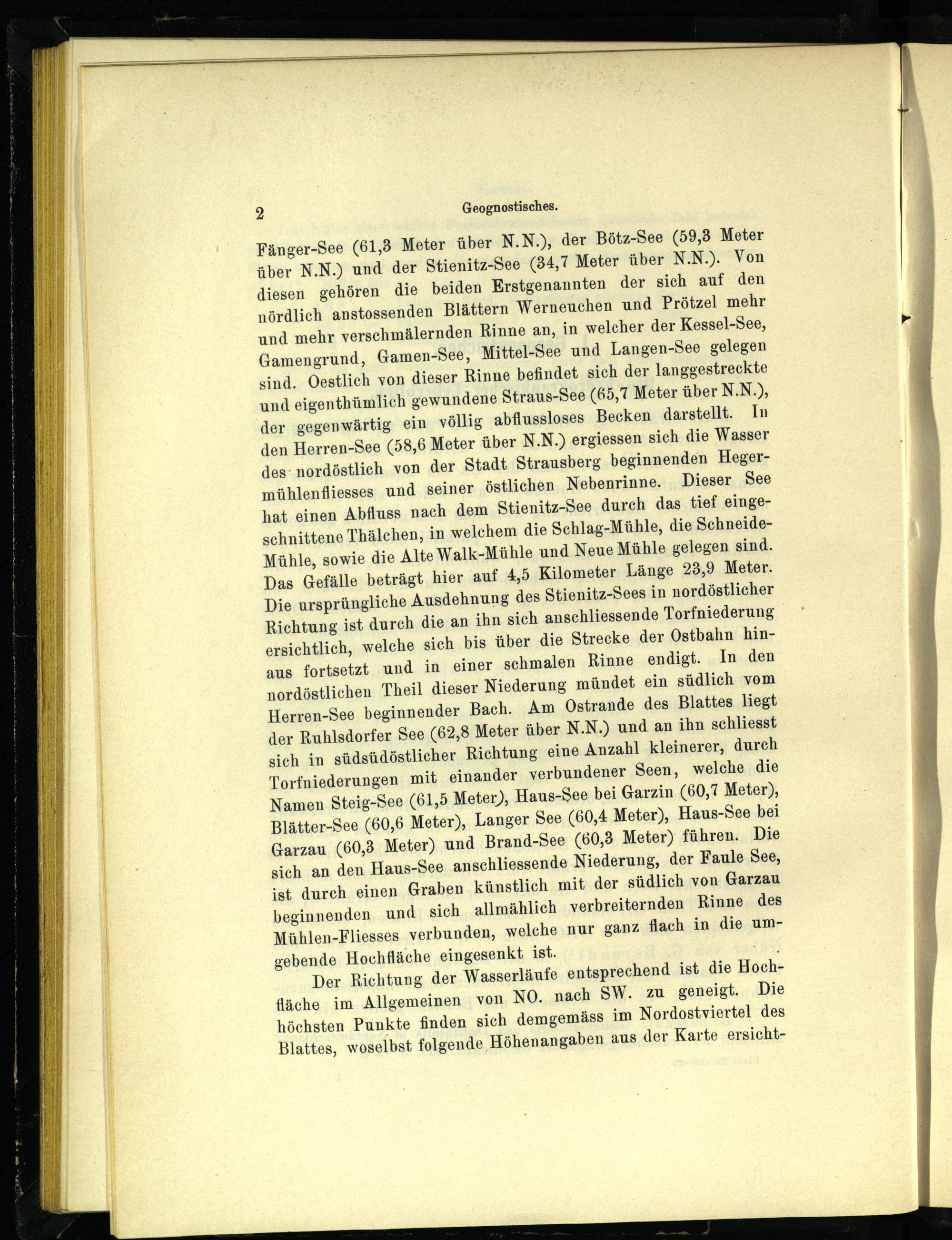 Fänger-See(61,3 Meter über N.N. ), der Bötz-See(59,8 Meter über N.N.) und der Stienitz-See(34,7 Meter über N.N.):. Von diesen gehören die beiden Erstgenannten der sich auf den nördlich anstossenden Blättern Werneuchen und Prötzel mehr und mehr verschmälernden Rinne an, in welcher der Kessel-See, Gamengrund, Gamen-See, Mittel-See und Langen-See gelegen sind. Oestlich von dieser Rinne befindet sich der langgestreckte und eigenthümlich gewundene Straus-See(65,7 Meter über N.N.), der gegenwärtig ein völlig abflussloses Becken darstellt. In den Herren-See(58,6 Meter über N.N.) ergiessen sich die Wasser des nordöstlich von der Stadt Strausberg beginnenden Hegermühlenfliesses und seiner östlichen Nebenrinne. Dieser See hat einen Abfluss nach dem Stienitz-See durch das tief eingeschnittene Thälchen, in welchem die Schlag-Mühle, die SchneideMühle, sowie die Alte Walk-Mühle und Neue Mühle gelegen sind. Das Gefälle beträgt hier auf 4,5 Kilometer Länge 23,9 Meter. Die ursprüngliche Ausdehnung des Stienitz-Sees in nordöstlicher Richtung ist durch die an ihn sich anschliessende Torfniederung ersichtlich, welche sich bis über die Strecke der Ostbahn hinaus fortsetzt und in einer schmalen Rinne endigt. In den nordöstlichen Theil dieser Niederung mündet ein südlich vom Herren-See beginnender Bach. Am Ostrande des Blattes liegt der Ruhlsdorfer See(62,8 Meter über N.N.) und an ihn schliesst sich in südsüdöstlicher Richtung eine Anzahl kleinerer, durch Torfniederungen mit einander verbundener Seen, welche die Namen Steig-See(61,5 Meter), Haus-See bei Garzin (60,7 Meter), Blätter-See(60,6 Meter), Langer See(60,4 Meter), Haus-See bei Garzau (60,3 Meter) und Brand-See(60,3 Meter) führen. Die sich an den Haus-See anschliessende Niederung, der Faule See, ist durch einen Graben künstlich mit der südlich von Garzau beginnenden und sich allmählich verbreiternden Rinne des Mühlen-Fliesses verbunden, welche nur ganz flach in die umgebende Hochfläche eingesenkt ist. A